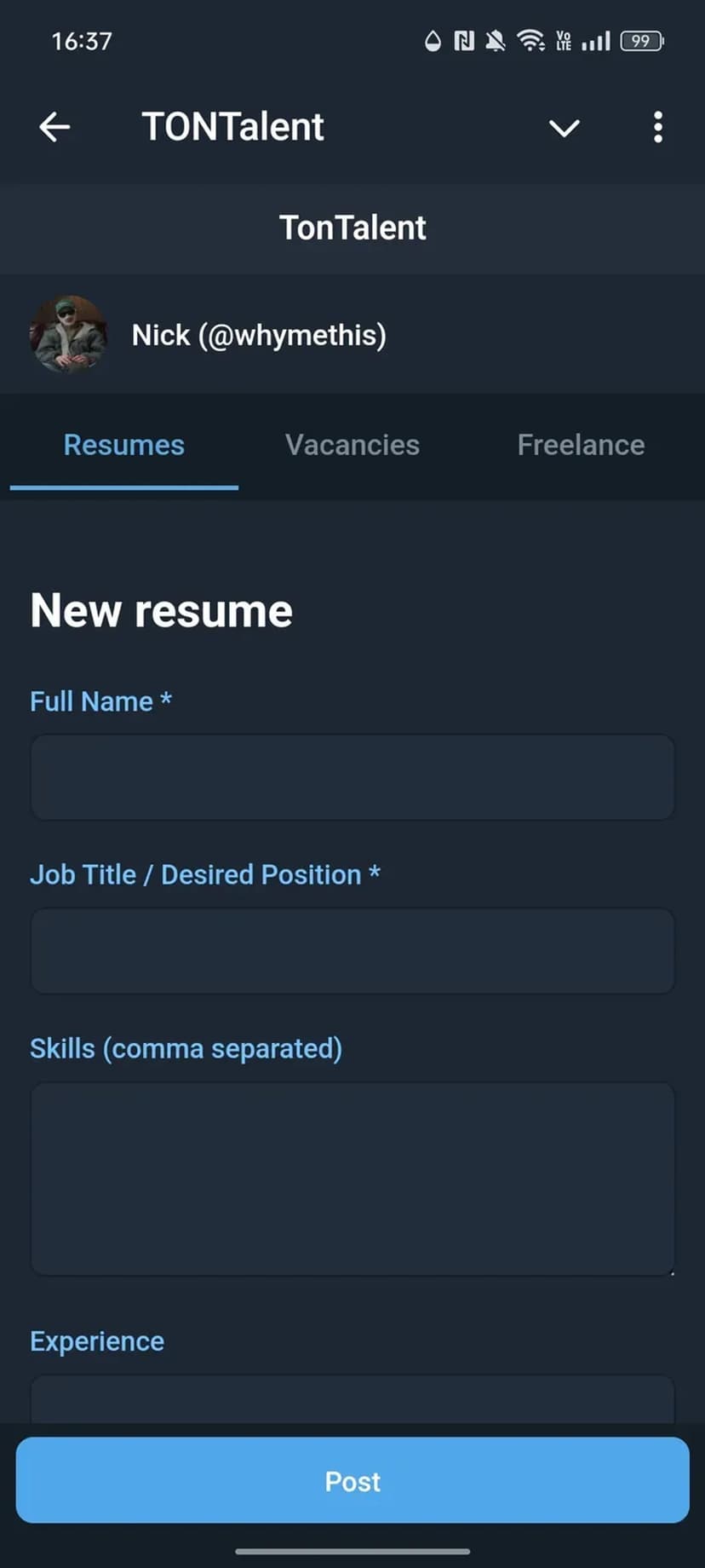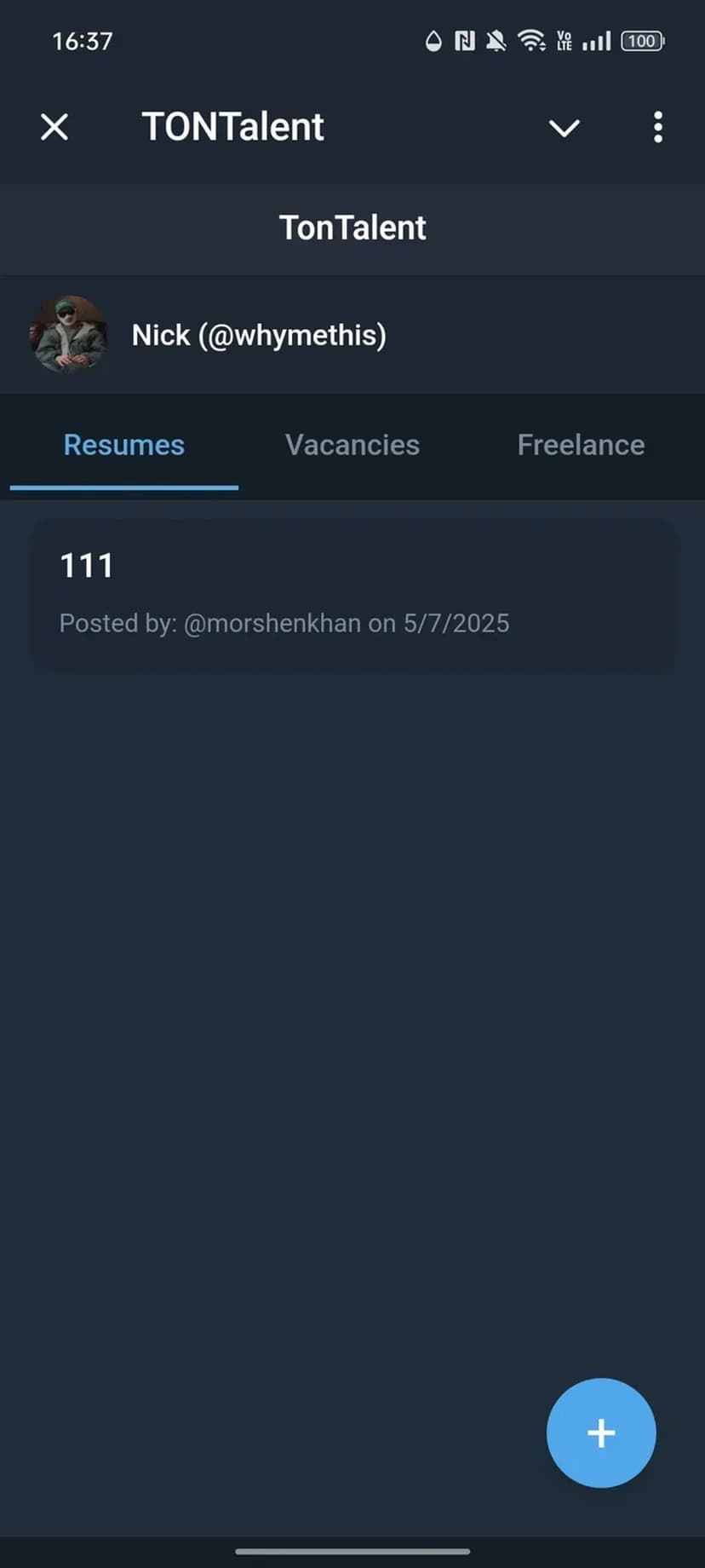 TONTalent — сервис внутри Telegram для поиска вакансий и подбора специалистов в экосистеме TON и Telegram. Интерфейс работает через Telegram Web Apps API и обеспечивает быстрый обмен резюме, сообщениями и файлами через бота.