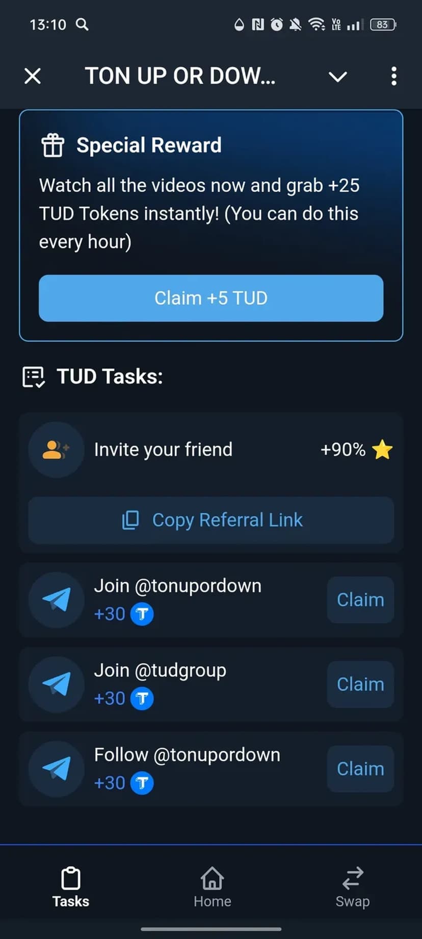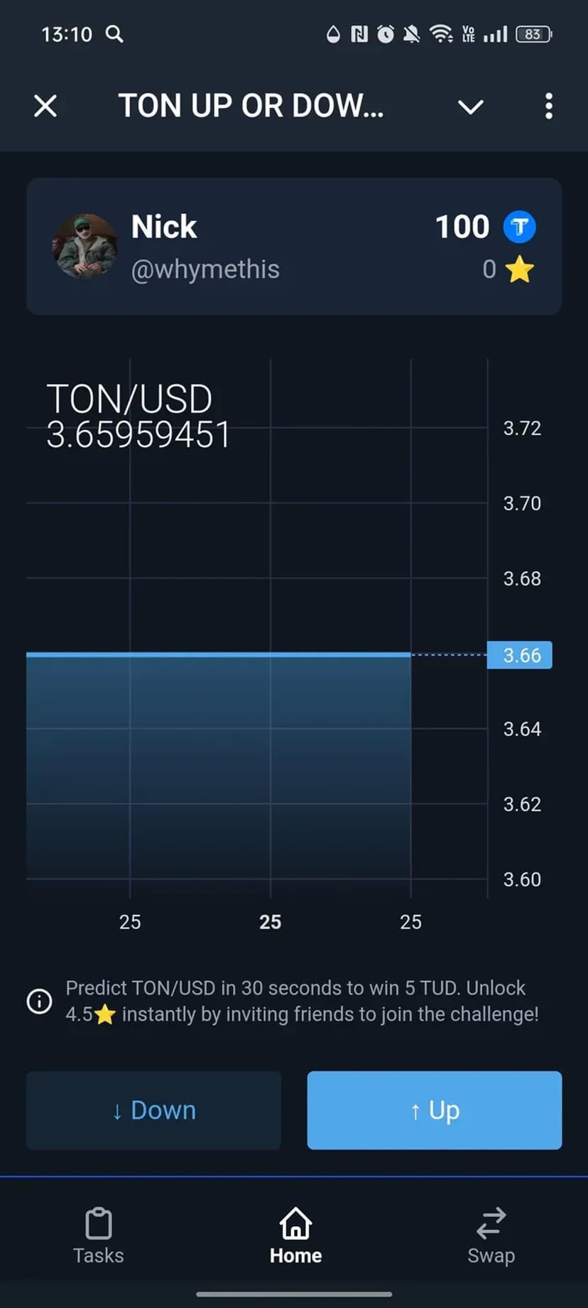 TON UP OR DOWN BOT — предсказательный рынок для криптовалюты TON прямо в Telegram. Пользователи ставят на рост или падение курса TON на коротких временных интервалах и получают вознаграждение за точные прогнозы. Бот работает полностью внутри Telegram для быстрого и простого взаимодействия.