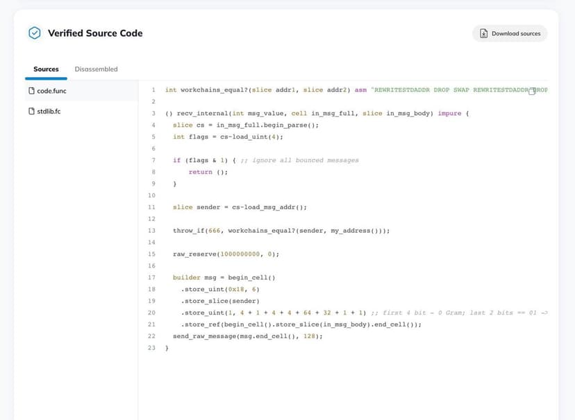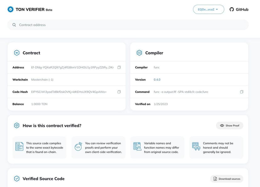 TON Verifier проверяет соответствие исходного кода смарт-контракта опубликованному байткоду в блокчейне TON.