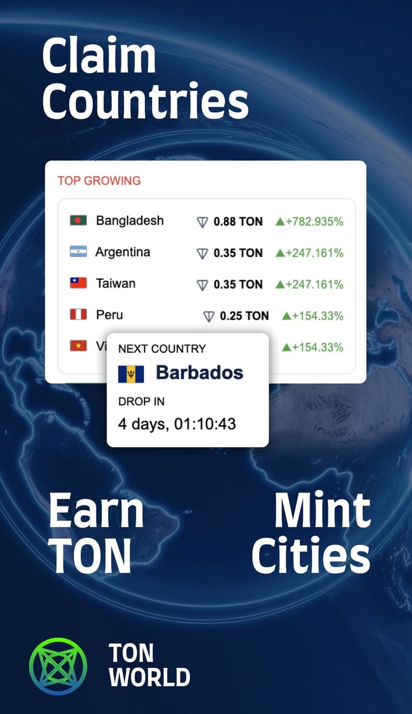 TON World — игровое мини‑приложение в Telegram на блокчейне TON, где владение виртуальными странами превращено в экономическую механику с возможностью заработка токенов.