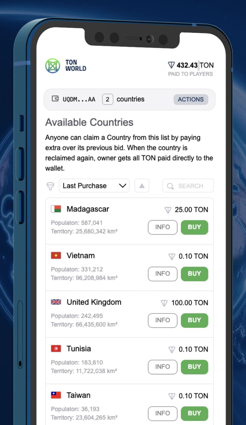 - Доход в TON: владельцы получают токены TON, когда другие игроки выкупают принадлежащие им территории.