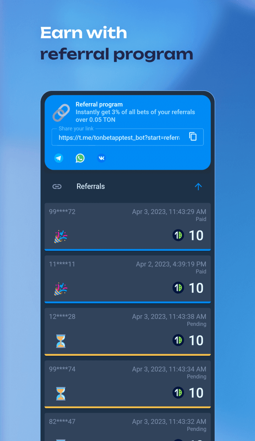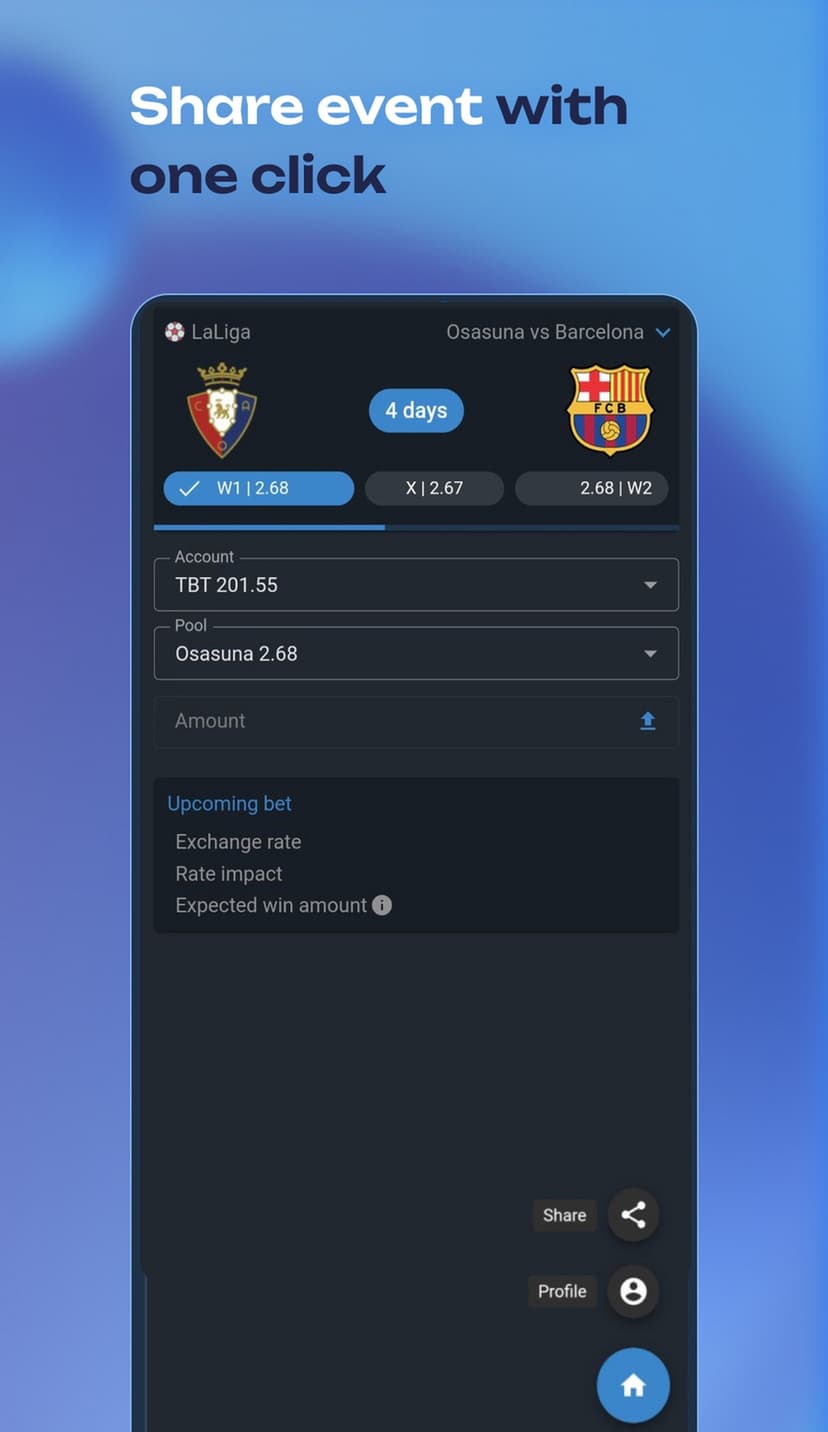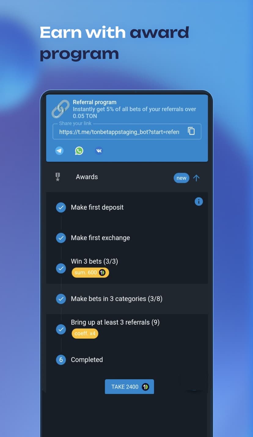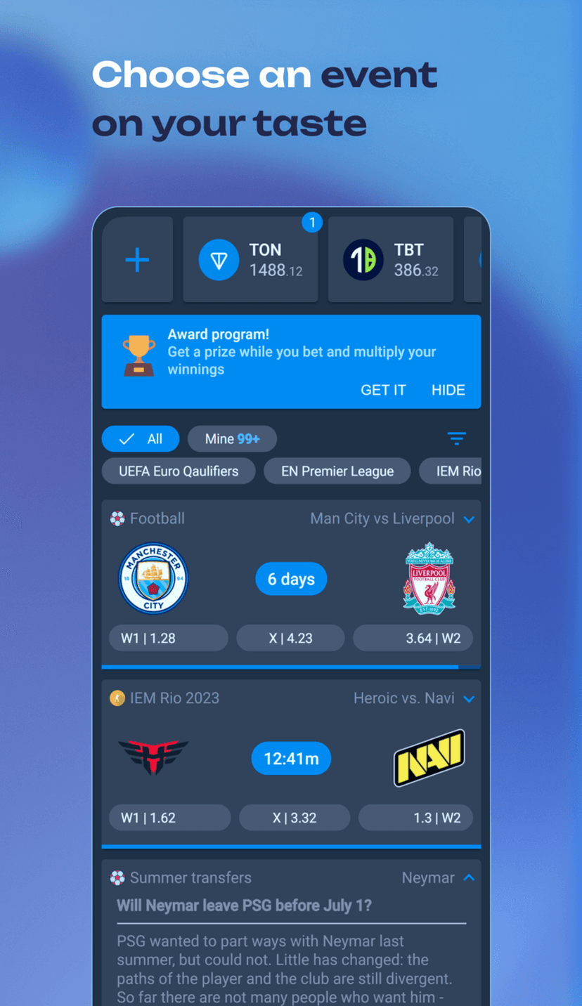 - Приём ставок: выбор события и суммы, оплата через TON-кошелёк или токен TBT; выигрыши автоматически зачисляются после завершения события.