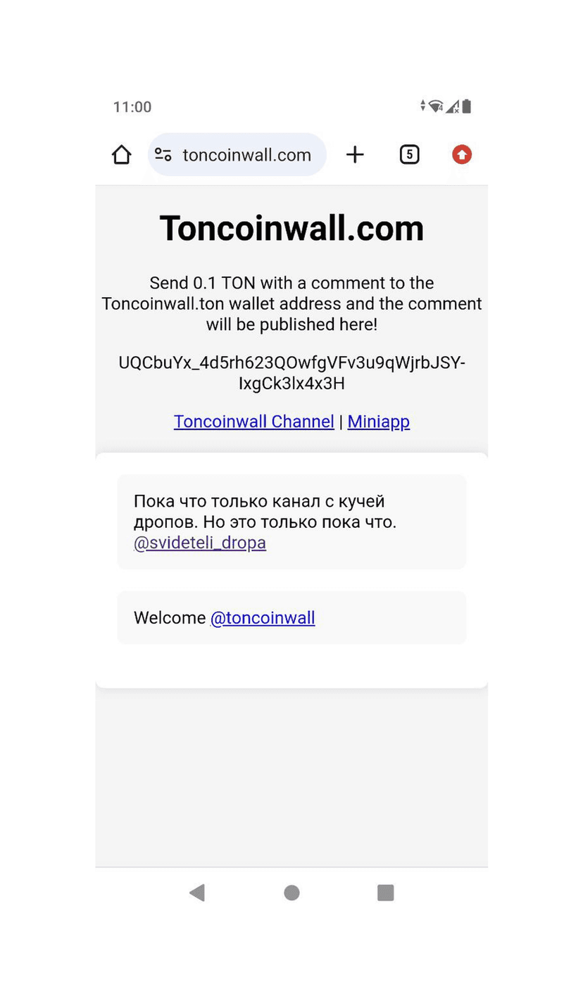 Toncoinwall.com даёт возможность быстро размещать текстовые сообщения на публичной веб-странице через Telegram-бота: перевод 0,1 TON с комментарием публикует ваше сообщение и делает его сразу доступным в общей ленте.