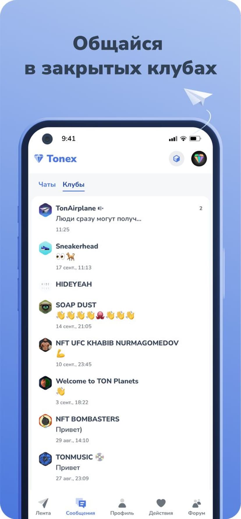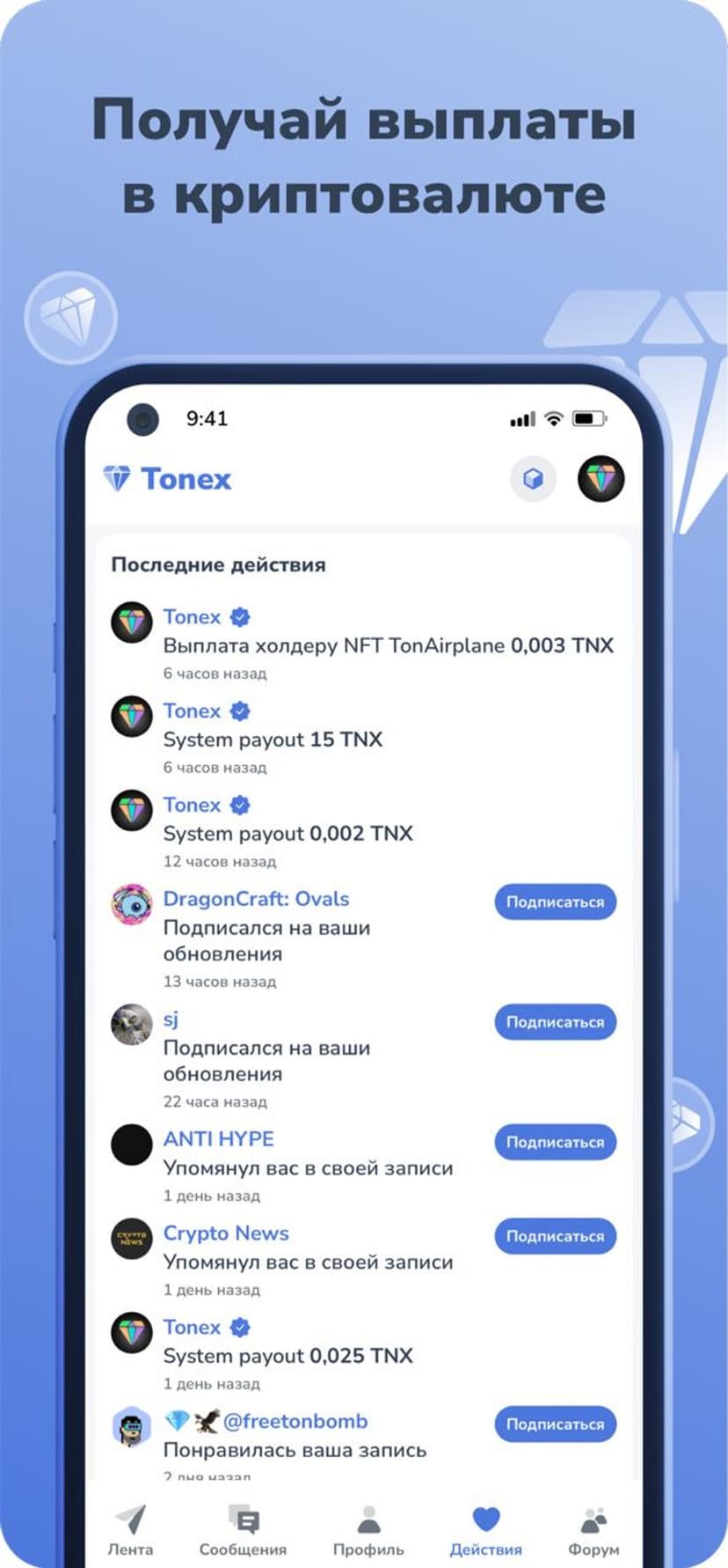 Tonex — децентрализованная социальная сеть на базе TON с современным мобильным интерфейсом: лента публикаций, профиль и нижнее меню для быстрого доступа к основным разделам. Проект ориентирован на приватность и даёт пользователю контроль над собственными данными, а также возможность взаимодействовать с криптовалютой TON.