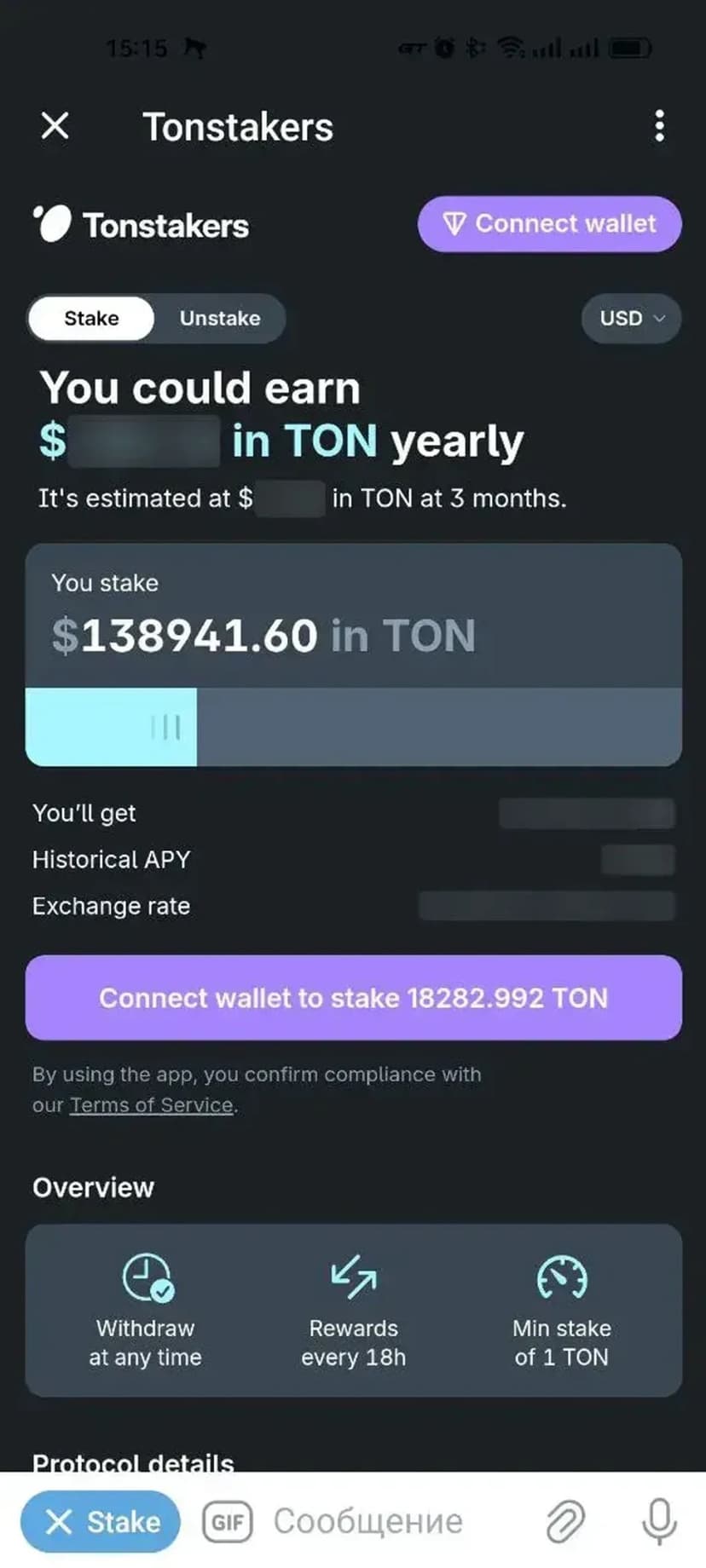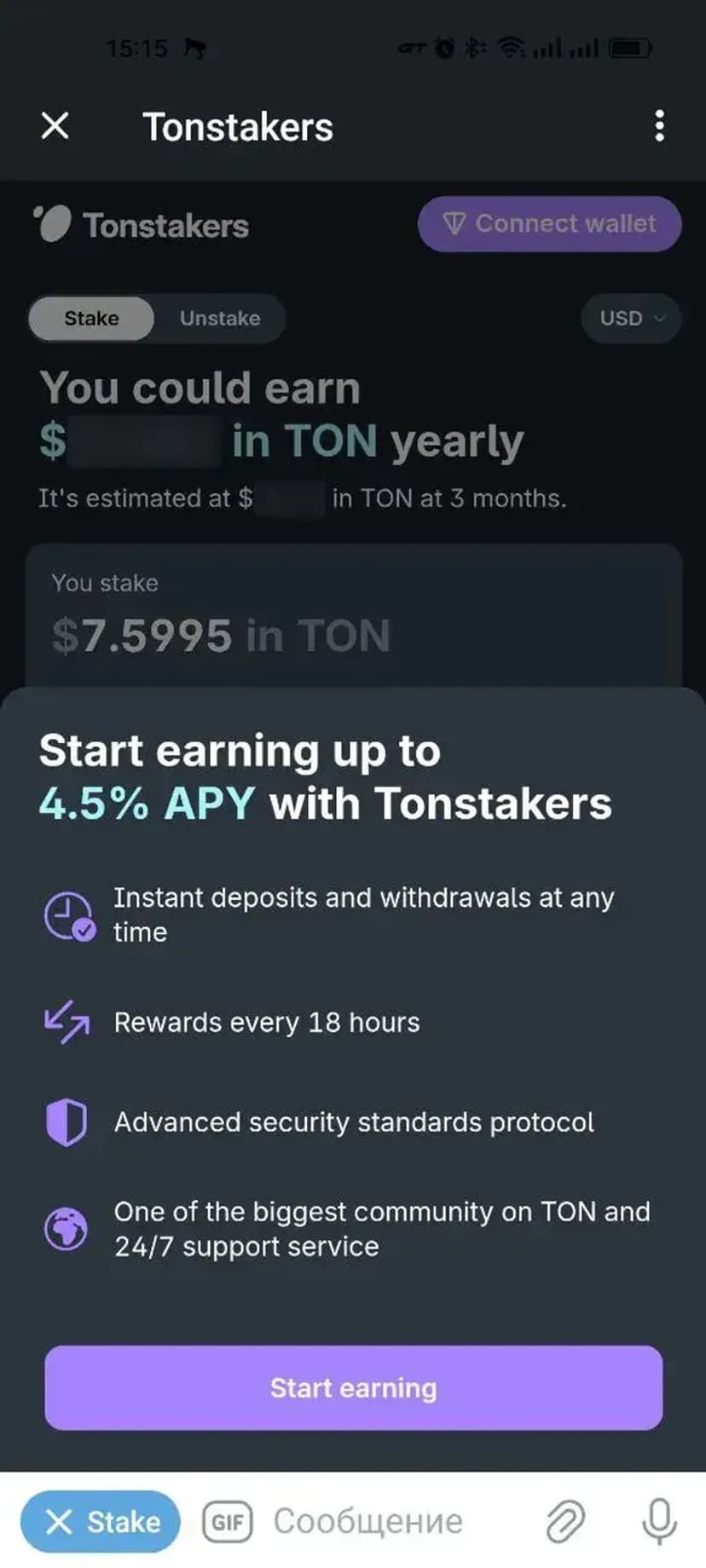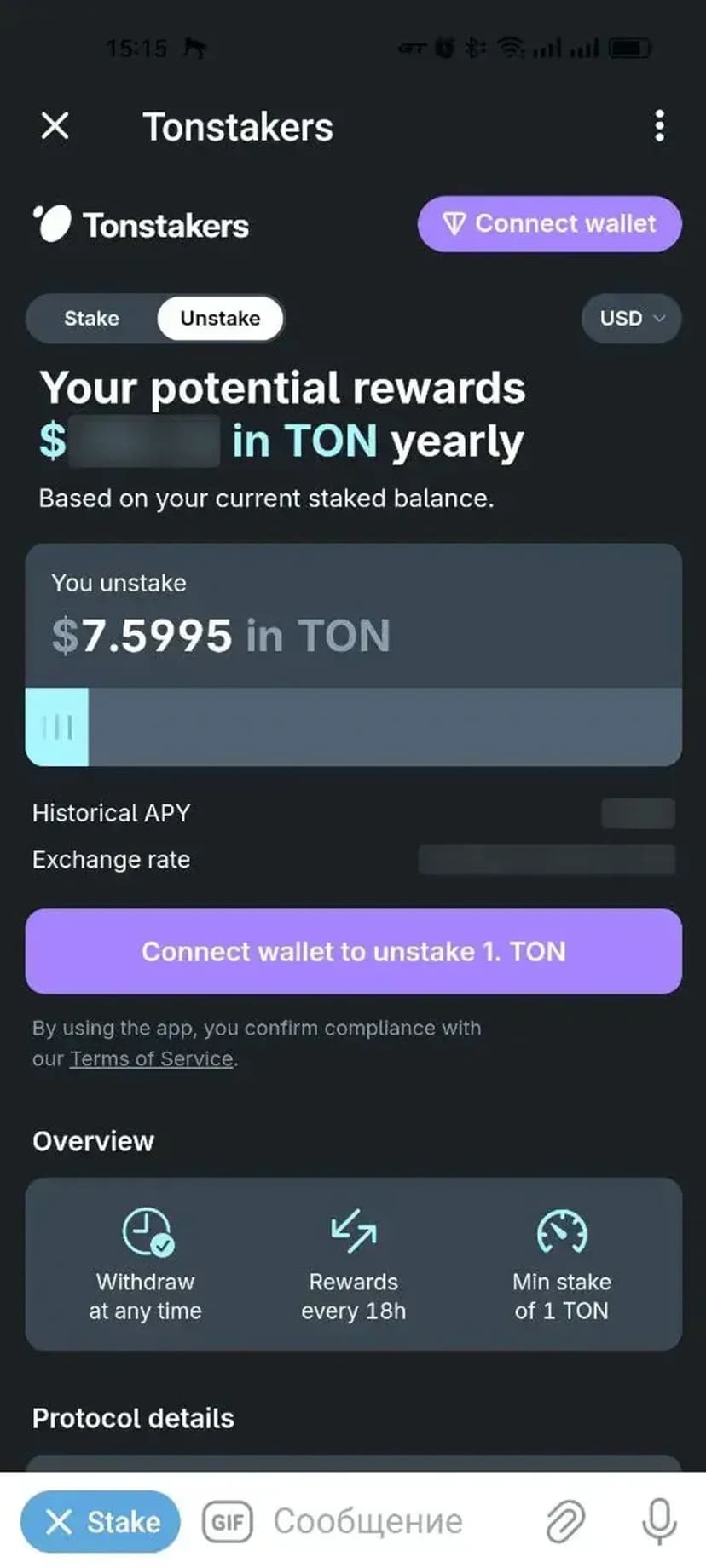 Для работы необходимо подключить TON-кошелек к сервису, выбрать сумму для стейкинга и подтвердить транзакцию. Начнёт начисляться вознаграждение, а через интерфейс можно в любой момент вывести средства или добавить новые депозиты.
