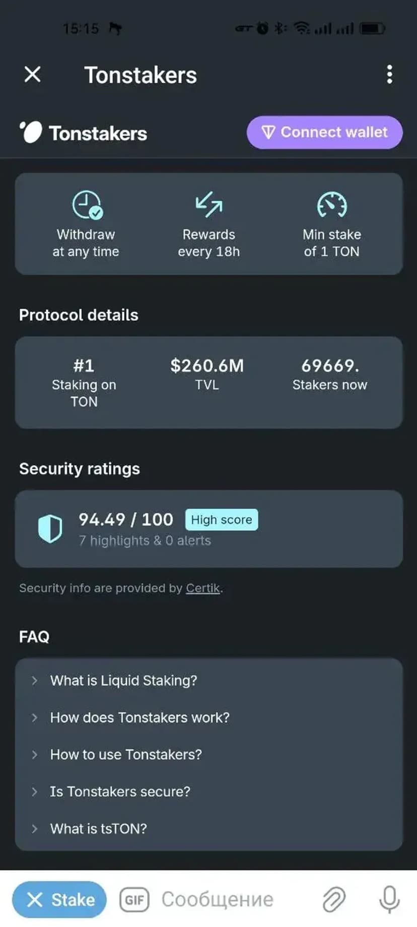 Tonstakers предоставляет возможность получать вознаграждения через Liquid Staking в сети TON с высокой доходностью (APY), сохраняя при этом доступ к своим токенам в любой момент.