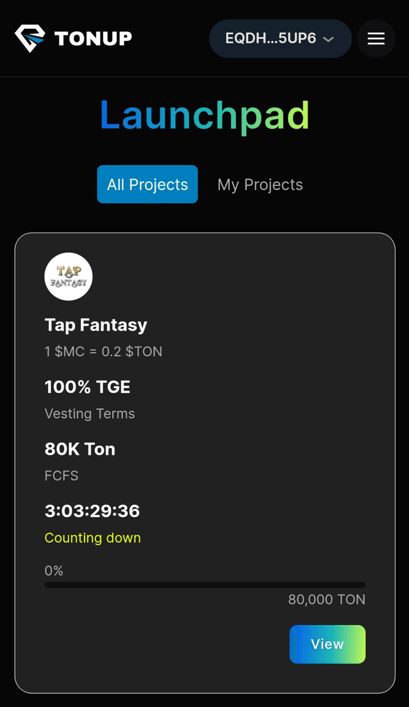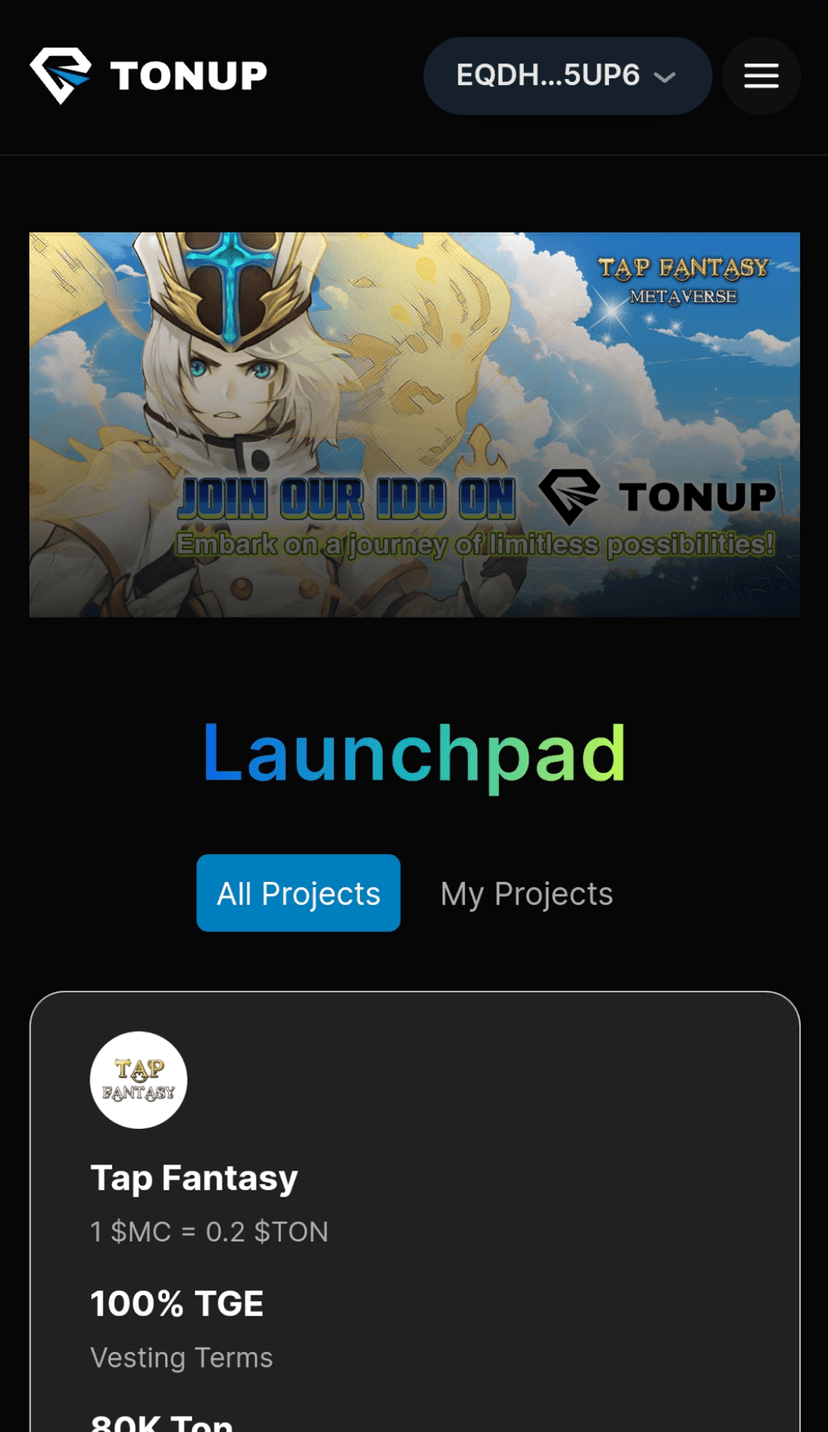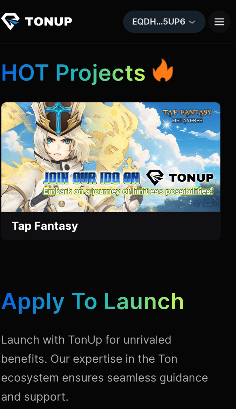 TONUP — лаунчпад для запуска и сопровождения криптопроектов в сети The Open Network (TON). Сервис предоставляет инфраструктуру, поддержку и аудит для команд, а инвесторам — инструменты для участия в публичных продажах и мониторинга проектов.