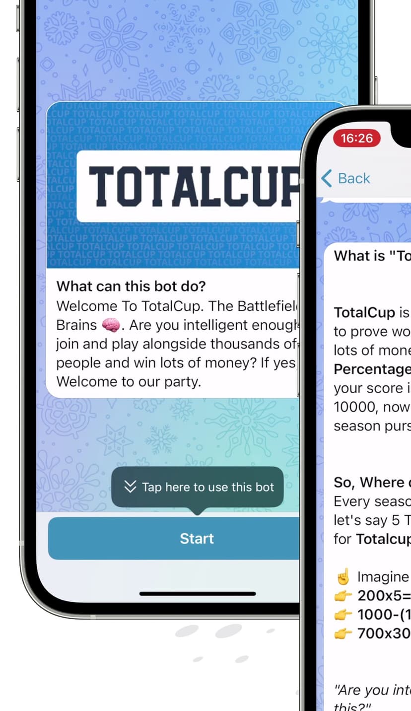 TotalCup — мини‑приложение в Telegram для сезонных интеллектуальных соревнований с денежными призами, формируемыми за счёт вступительных взносов.