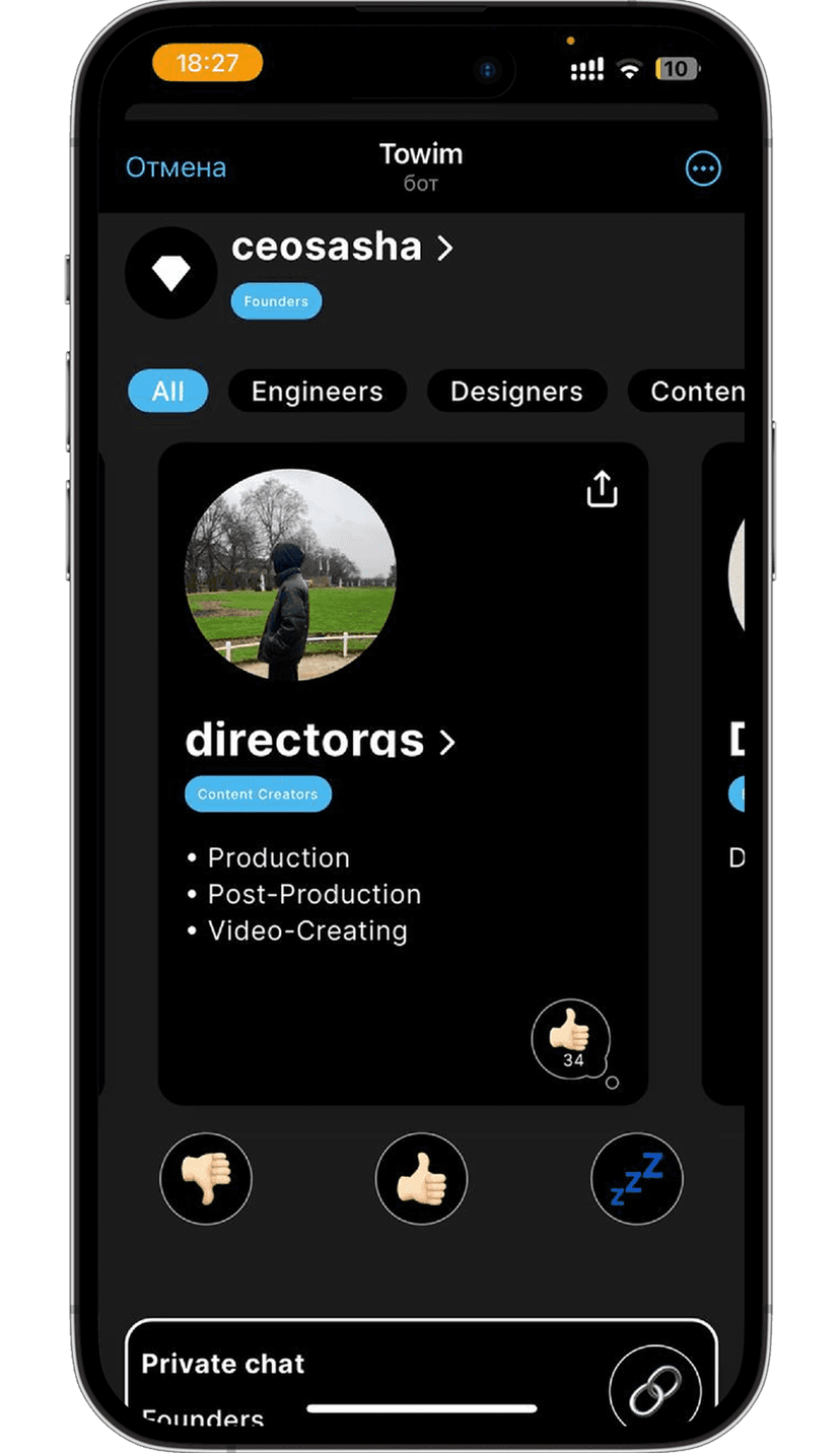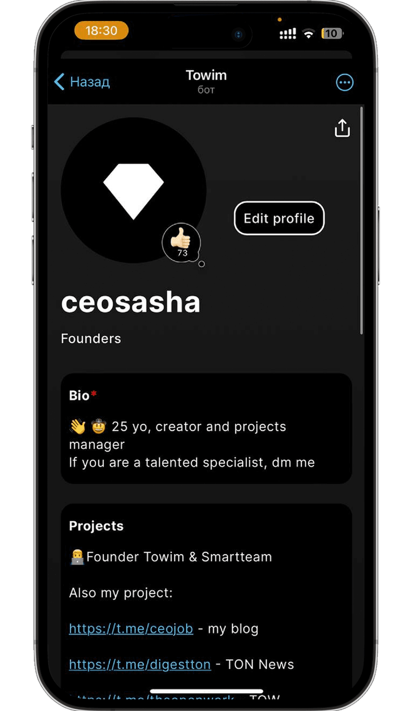 Towim — платформа знакомств и профессионального нетворкинга для специалистов и энтузиастов в IT, криптовалютах, блокчейне и веб‑разработке. Доступ осуществляется через Telegram‑бота; отдельная регистрация не требуется.