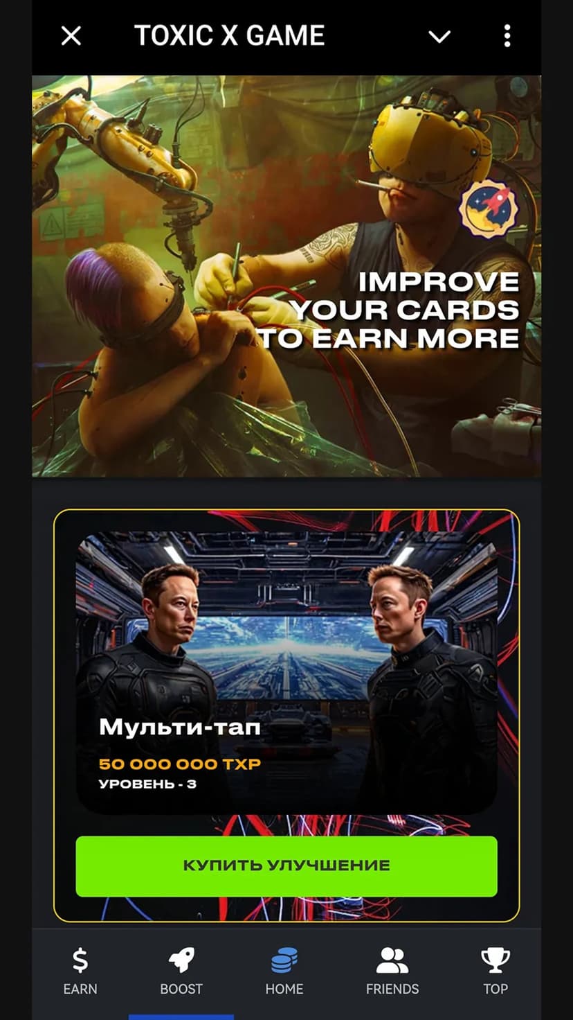 TOXIC X GAME — кликер с элементами play-to-earn и интеграцией NFT. За игровую активность и участие в событиях игроки получают токены $TX, проходят уровни, взаимодействуют с персонажами и собирают редкие предметы, каждый из которых может быть выпущен как NFT.