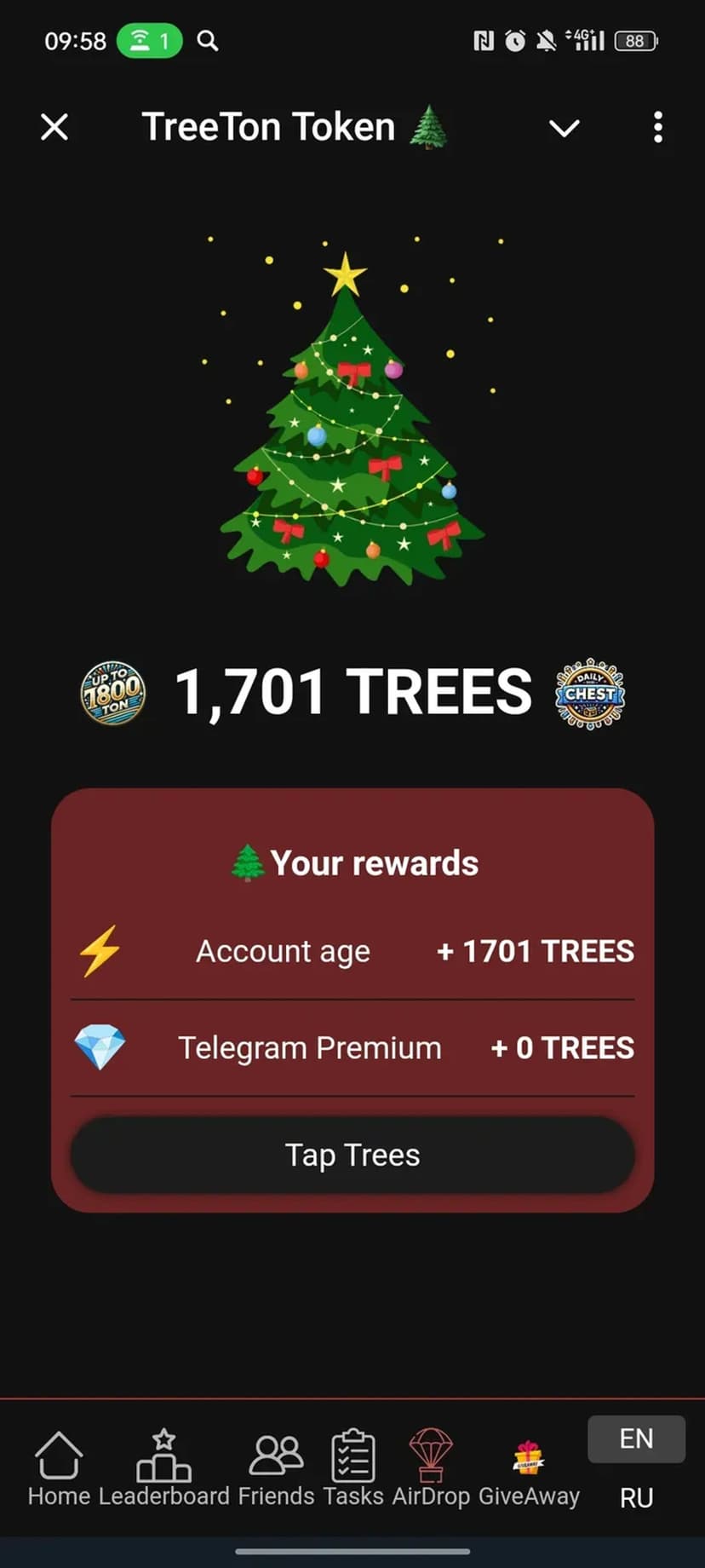 - ΠΠ³Π½ΠΎΠ²Π΅Π½Π½Π°Ρ ΠΎΡΠΏΡΠ°Π²ΠΊΠ° ΠΈ ΠΏΡΠΈΡΠΌ ΡΠΎΠΊΠ΅Π½ΠΎΠ² TreeTon ΠΌΠ΅ΠΆΠ΄Ρ ΠΏΠΎΠ»ΡΠ·ΠΎΠ²Π°ΡΠ΅Π»ΡΠΌΠΈ Telegram.