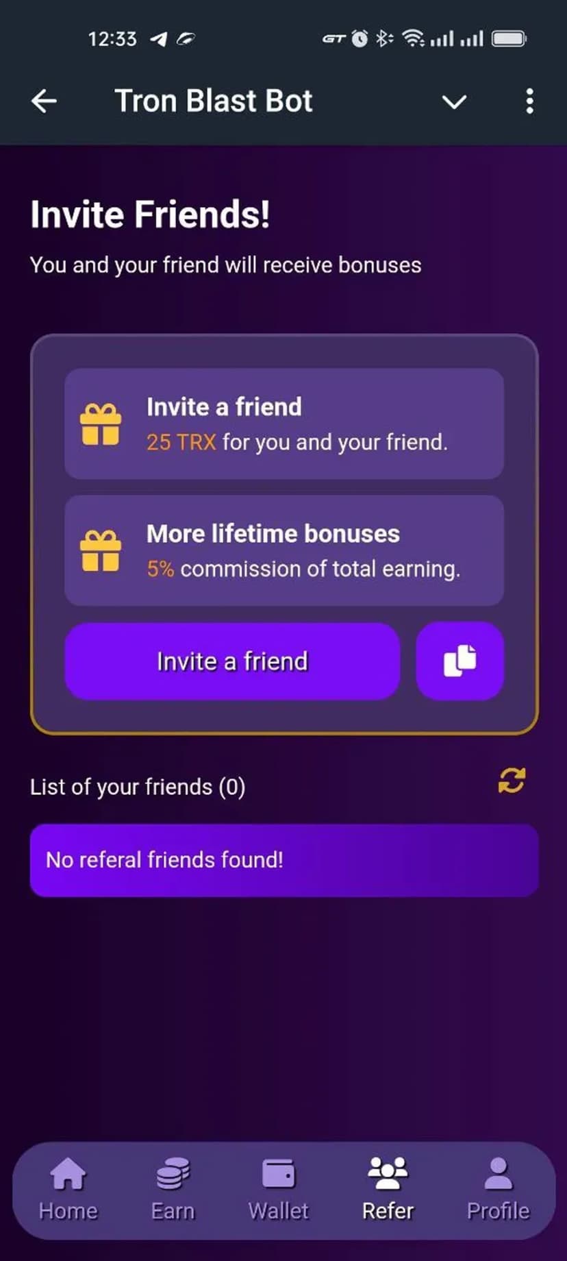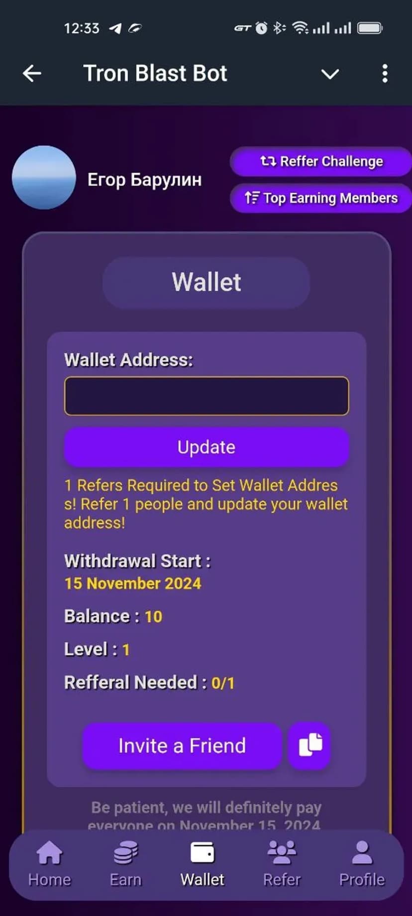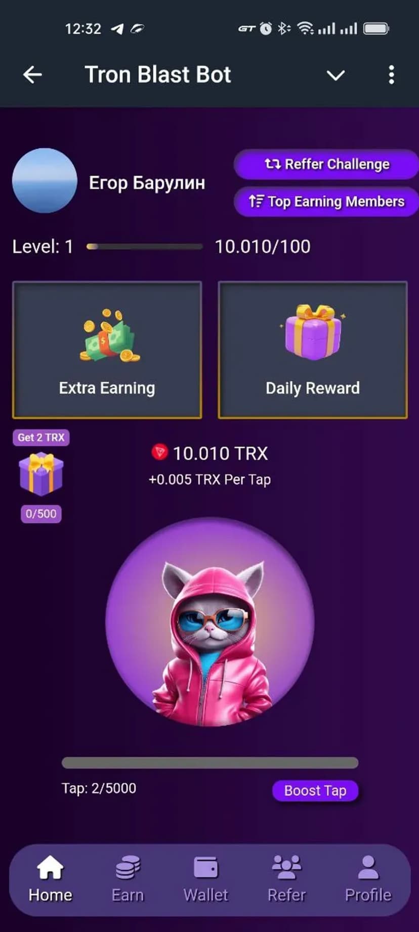 Tron Blast Bot позволяет получать вознаграждение в криптовалюте TRX за простые действия внутри интерфейса: клики и выполнение небольших заданий. Награды начисляются в токенах TRX и доступны к выводу на кошелёк Tron.