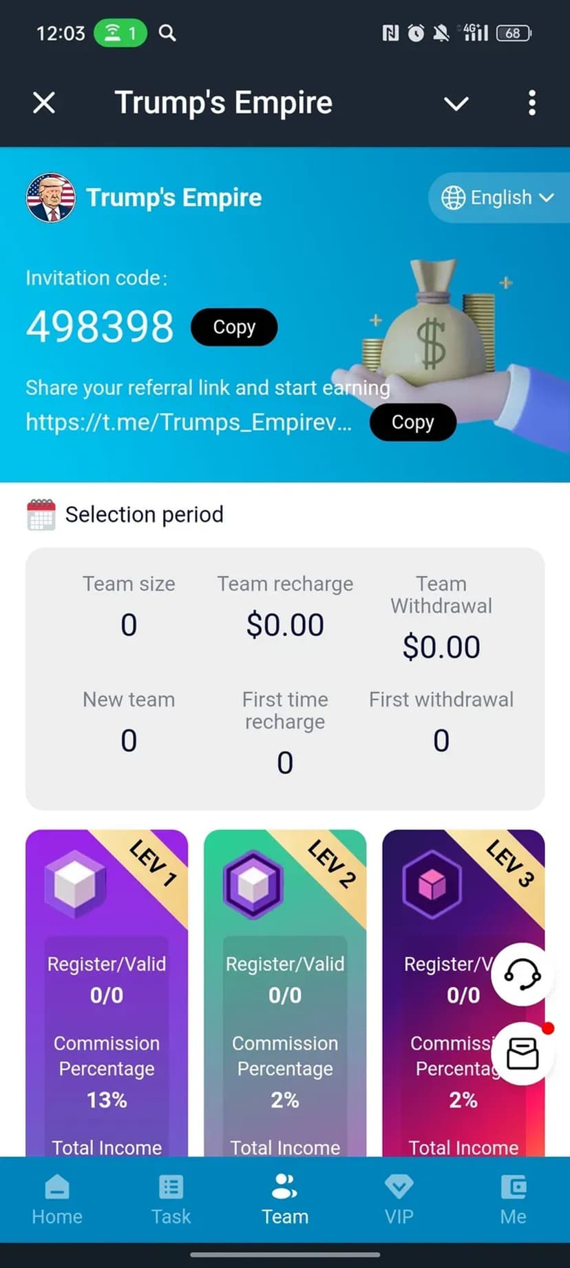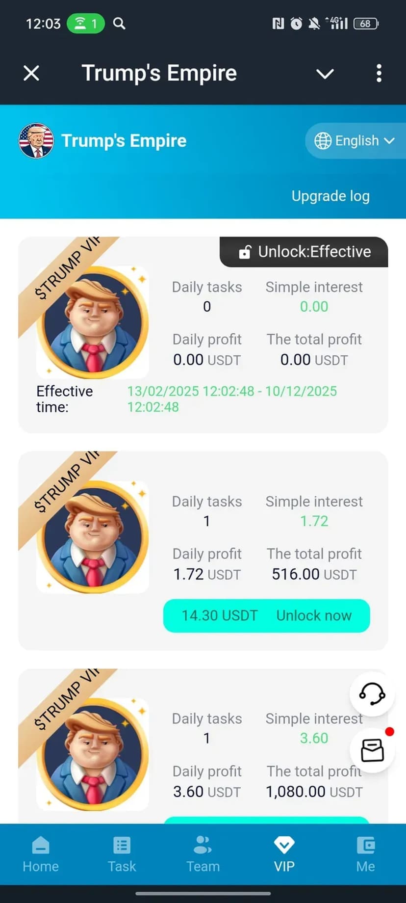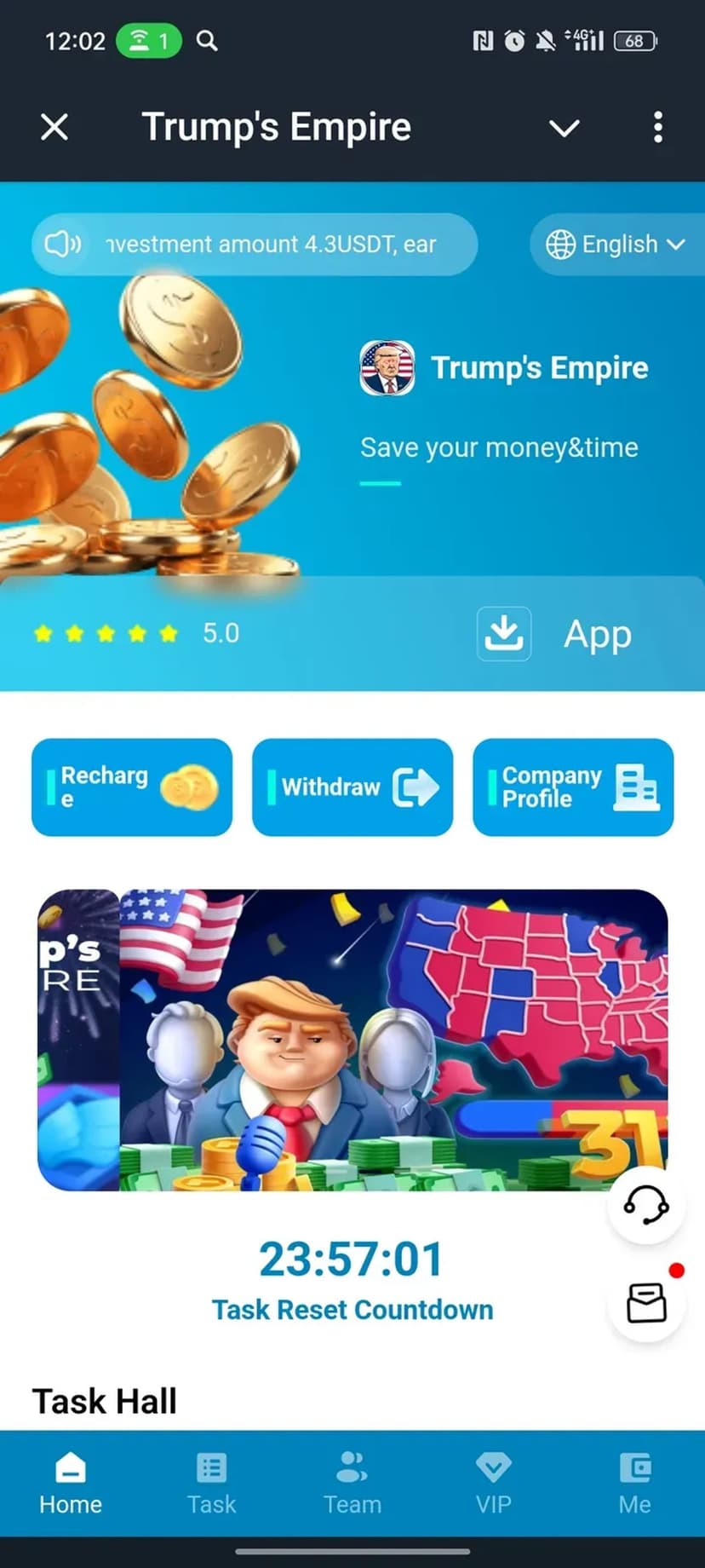 Trump's Empire — мини‑игра внутри Telegram, где можно получать вознаграждения в USDT за выполнение игровых заданий, приглашения и повышение уровня аккаунта.