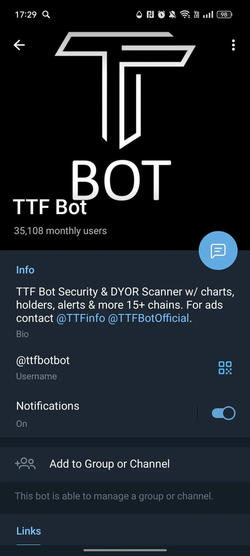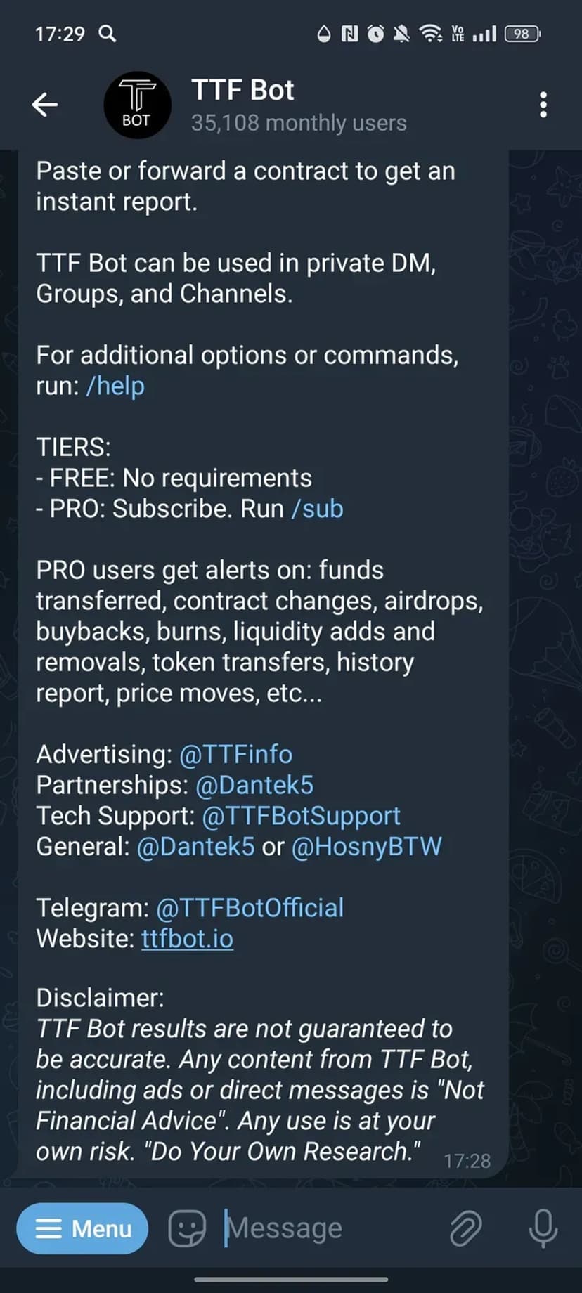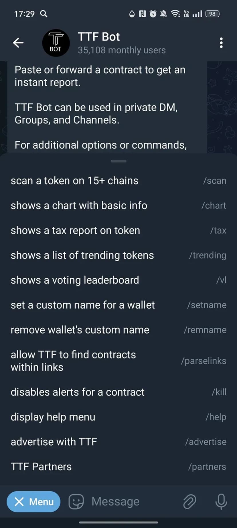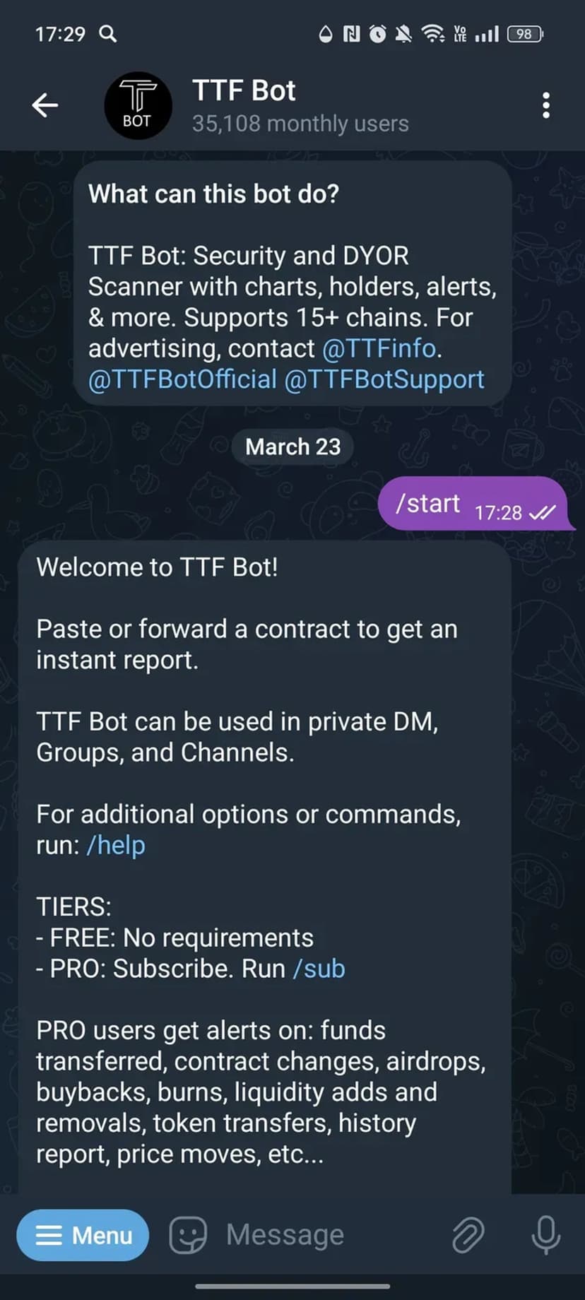 TTF Bot — бот для быстрого DYOR и мониторинга криптотокенов прямо в Telegram. Более 30 000 пользователей ежемесячно используют его для оценки безопасности токенов, просмотра графиков и отслеживания холдеров.