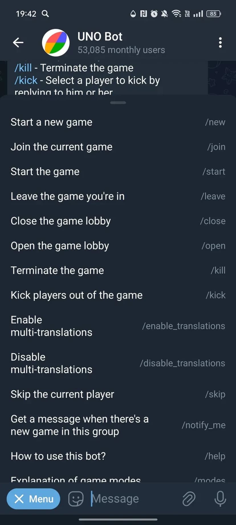 Играть в UNO вместе с участниками группового чата можно прямо в мессенджере — все ходы и управление выполняются через команды и инлайн‑меню, без установки дополнительных сторонних программ.