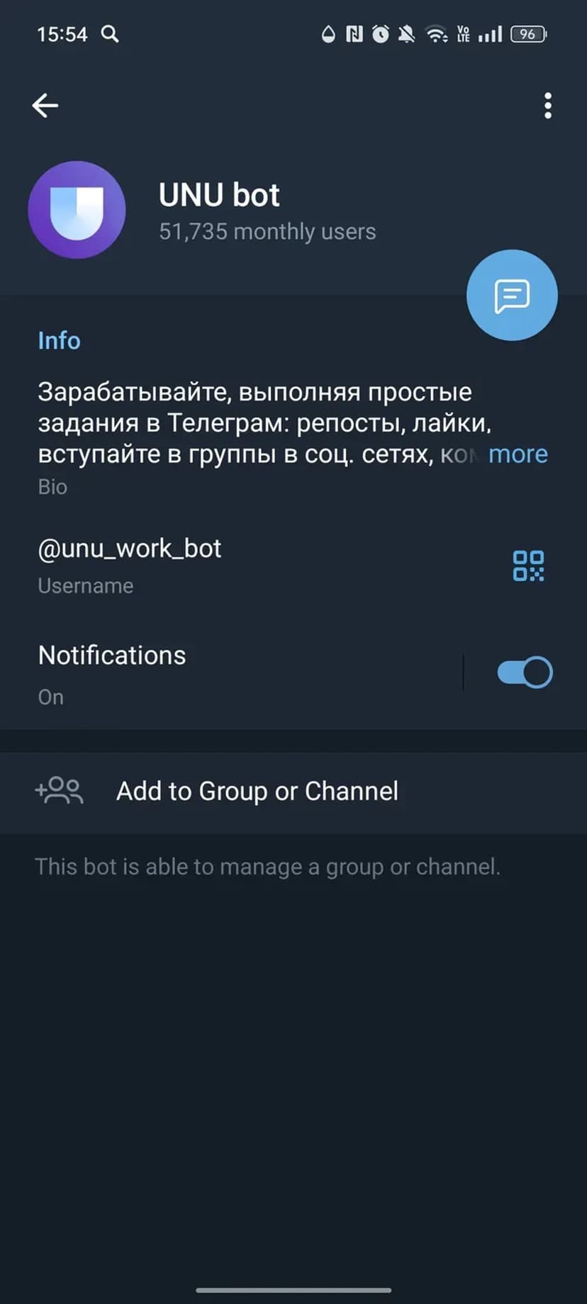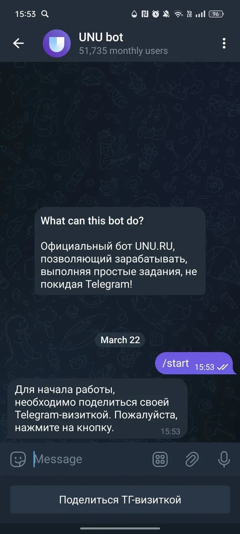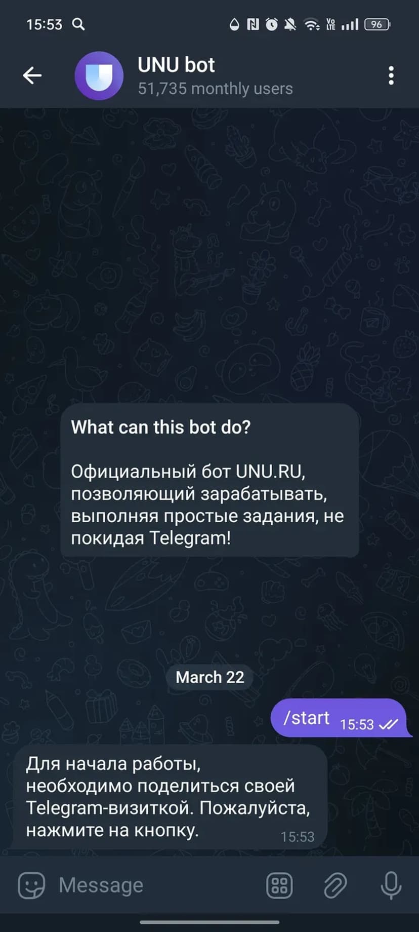 UNU bot — мини‑сервис в Telegram для заработка на простых заданиях в социальных сетях и мессенджерах: репосты, лайки, вступления в группы, комментарии и другие активности. Все действия выполняются внутри мессенджера и доступны с любого устройства.