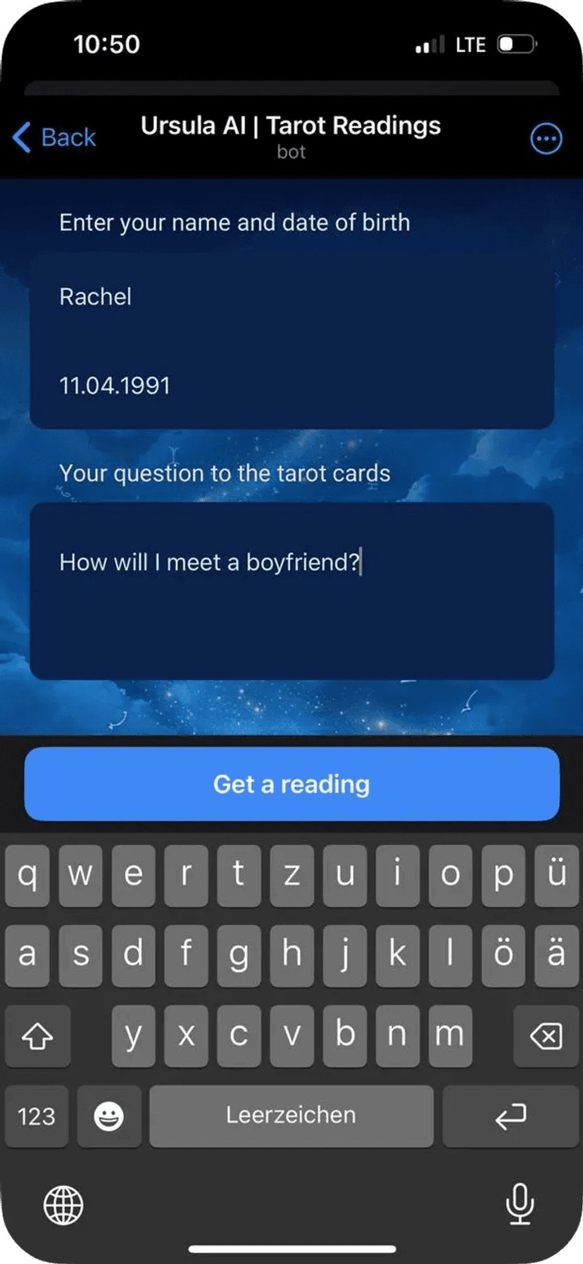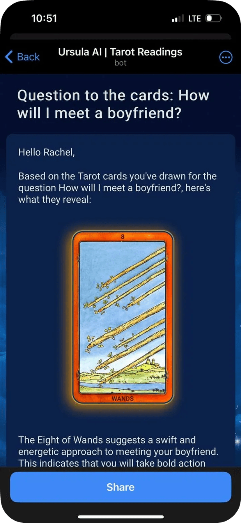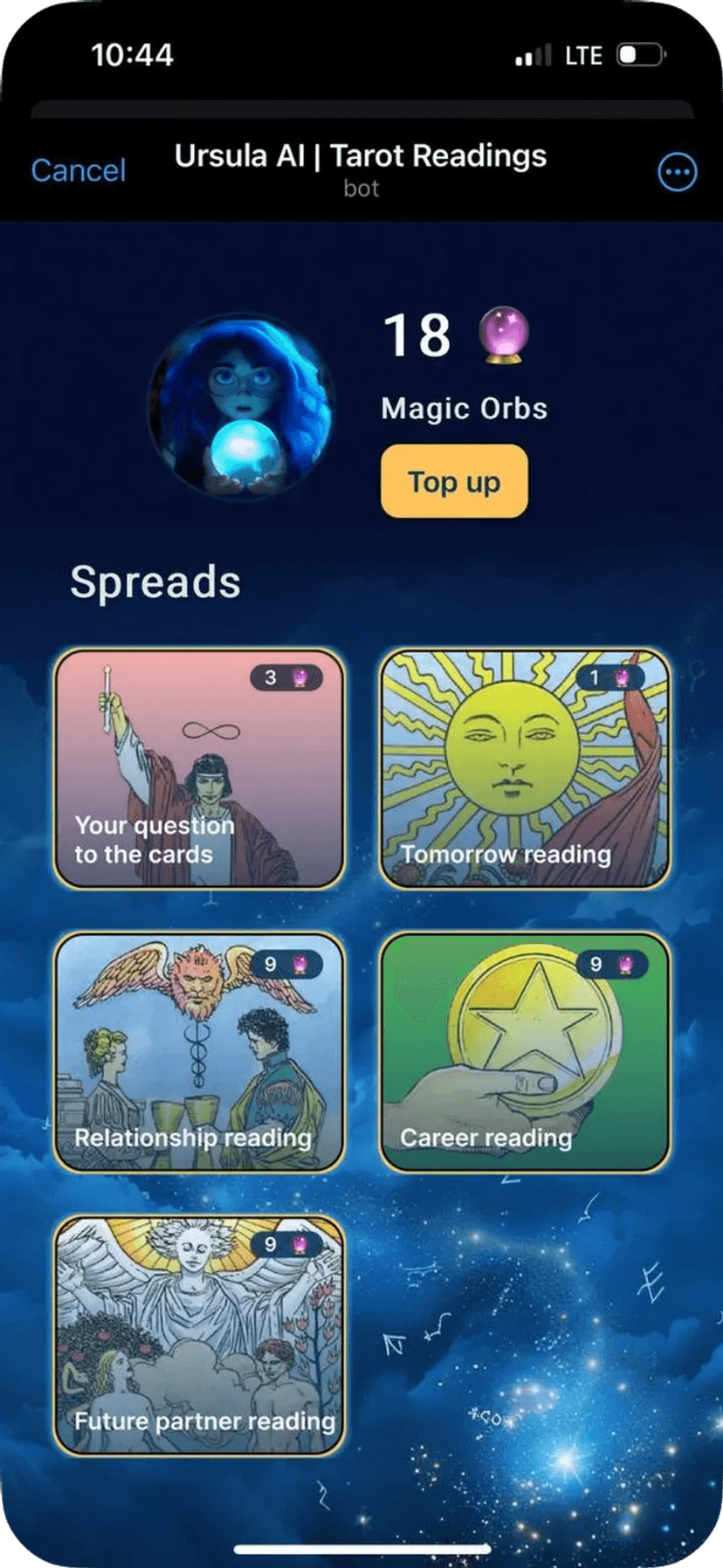 Ursula | Tarot Readings выполняет автоматические расклады Таро по выбранным темам — отношения, карьера, личные вопросы и другим жизненным сферам. Работа полностью в чате, без необходимости регистрации.