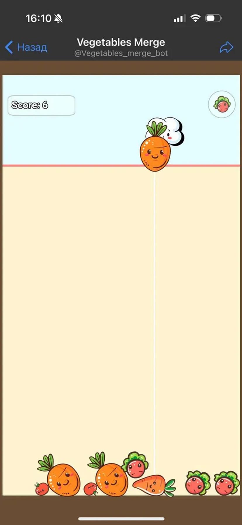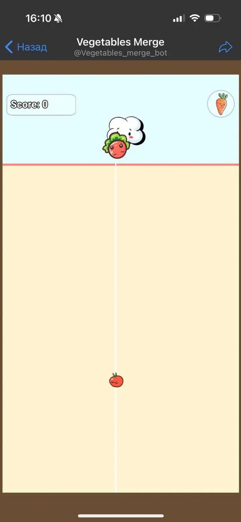 Казуальная головоломка с механизмом слияния: игрок соединяет одинаковые овощи на игровом поле, чтобы получить новые виды и увеличить счёт. Поле отображается ботом и автоматически обновляется после каждого хода.