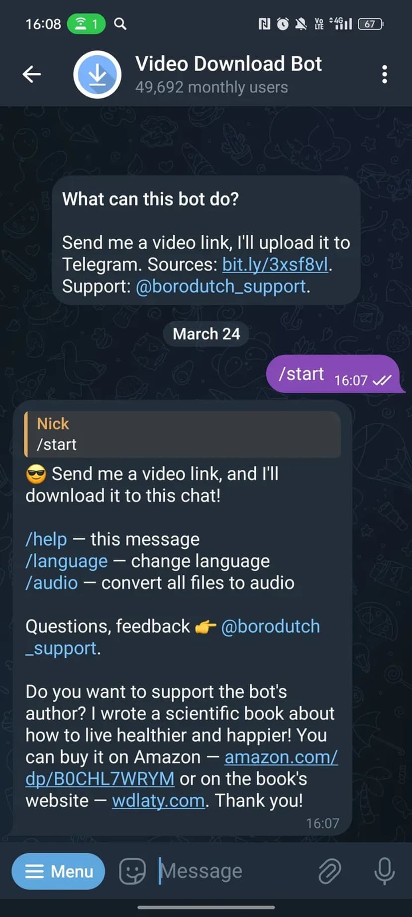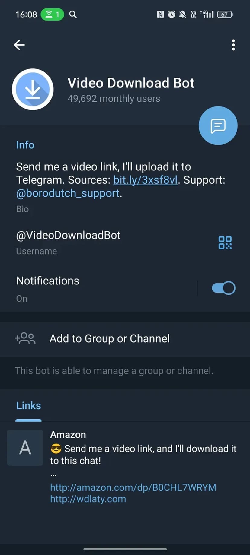 - Поддержка разных платформ: бот работает со ссылками с различных сайтов (список платформ указан в описании бота).