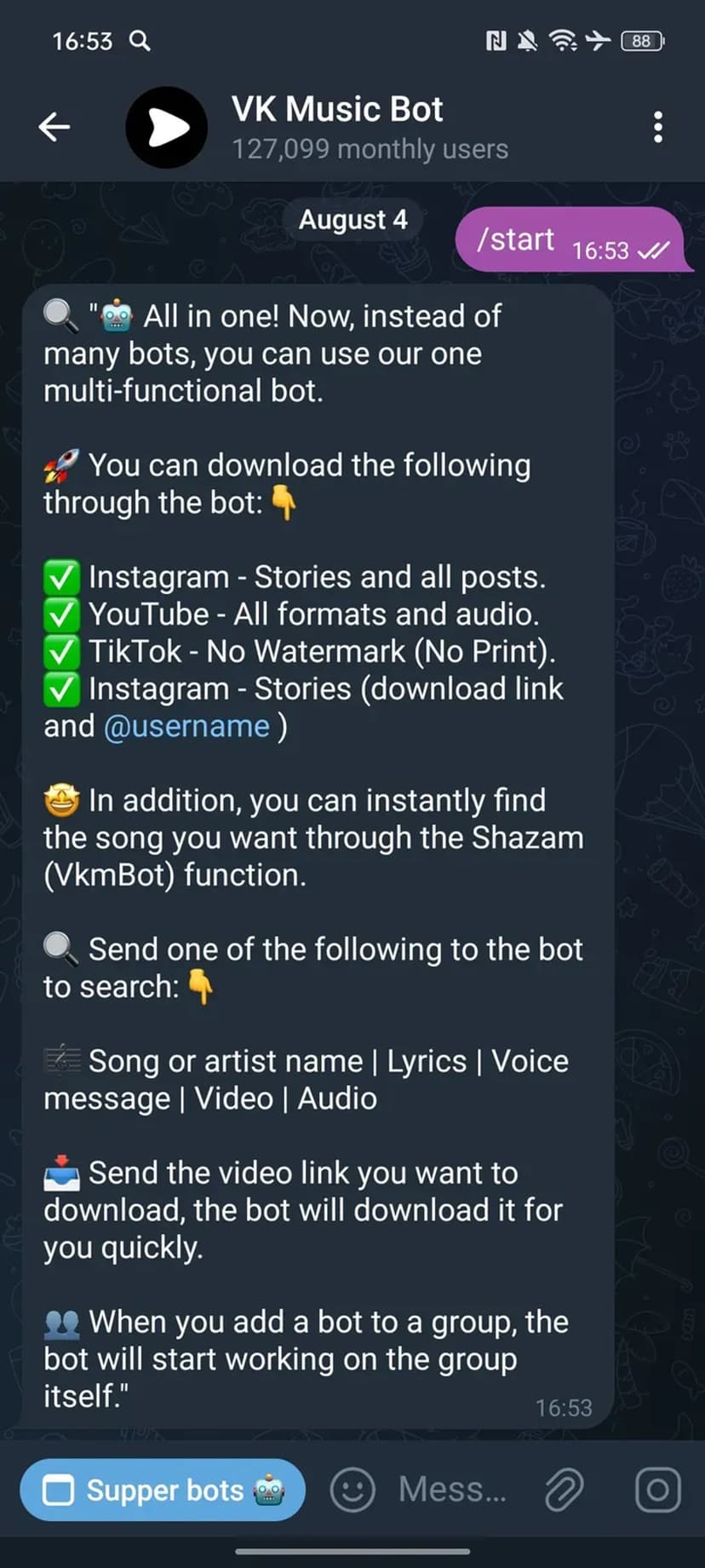 VK Music Bot помогает быстро получать музыку и видео из популярных платформ и распознавать треки по разным источникам.