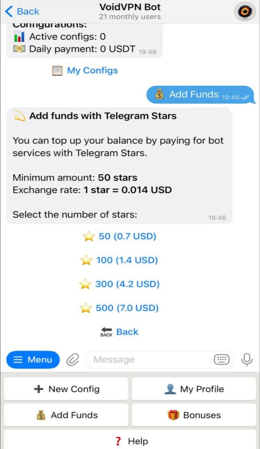 VoidVPN предоставляет быстрый доступ к защищённому интернету прямо в Telegram без необходимости установки дополнительного ПО. Подключение выполняется через автоматически сгенерированные конфигурации, что упрощает старт для неопытных пользователей.