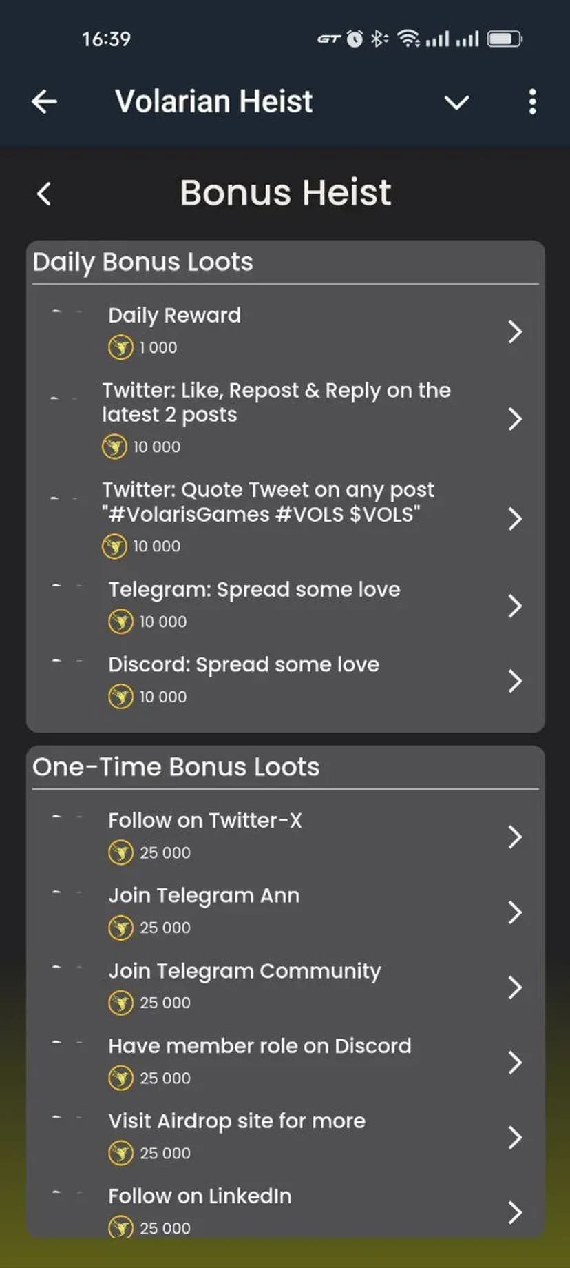 Выбирайте доступные задания, выполняйте их и получайте xVOLS. Для ускорения и повышения заработка используйте внутриигровые улучшения; расширение команды через приглашения даёт дополнительные бонусы, а прогресс отображается в чате.