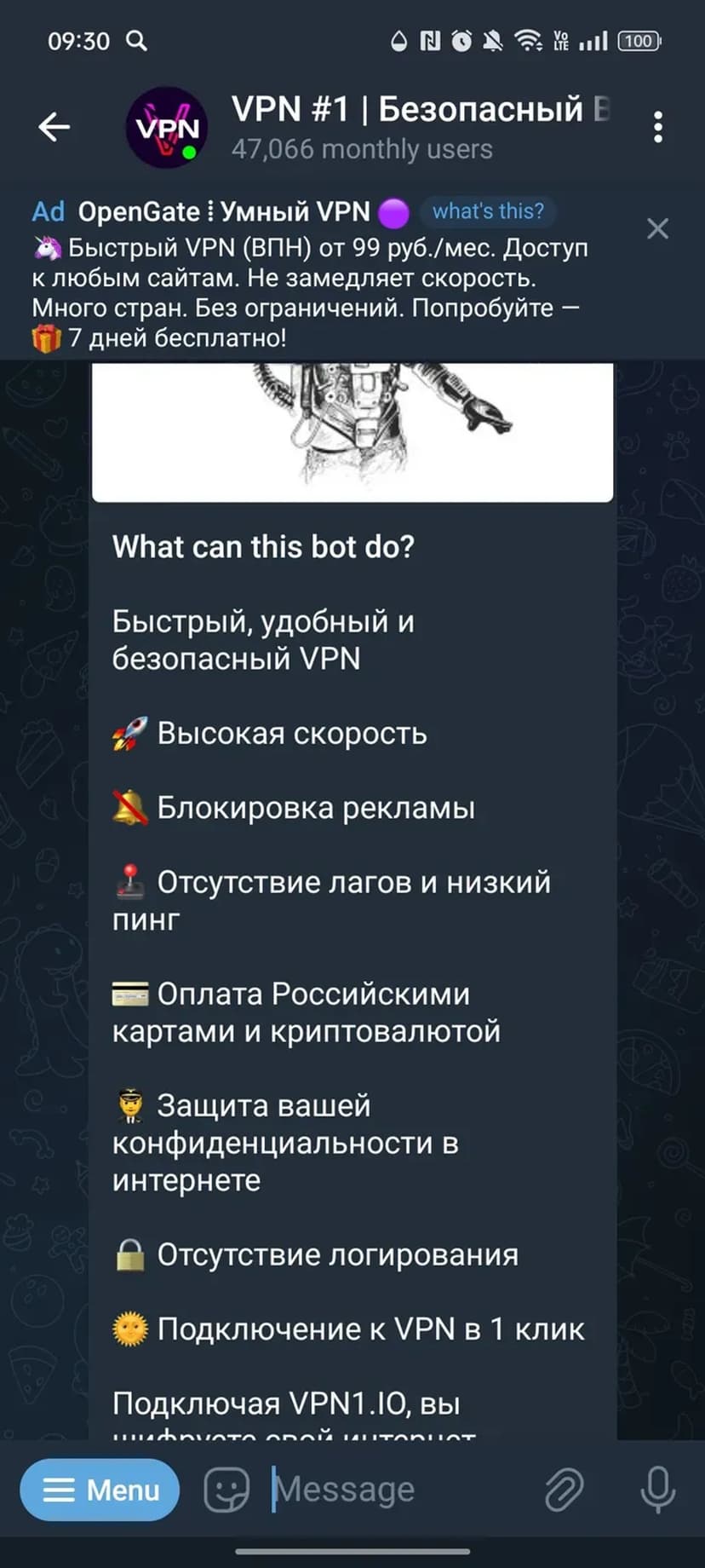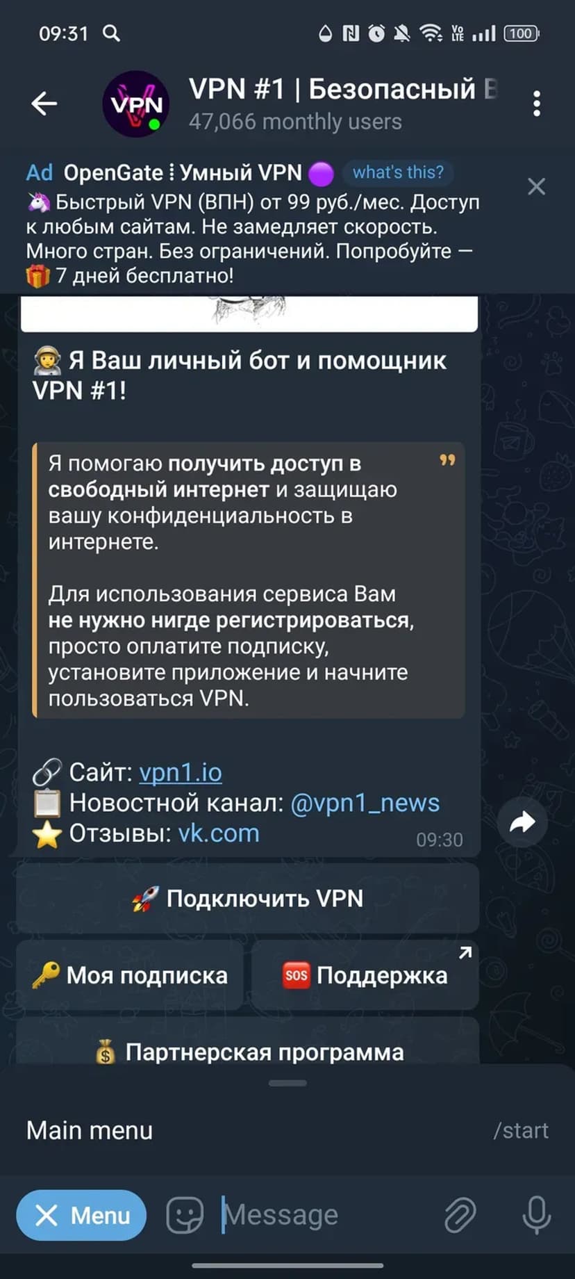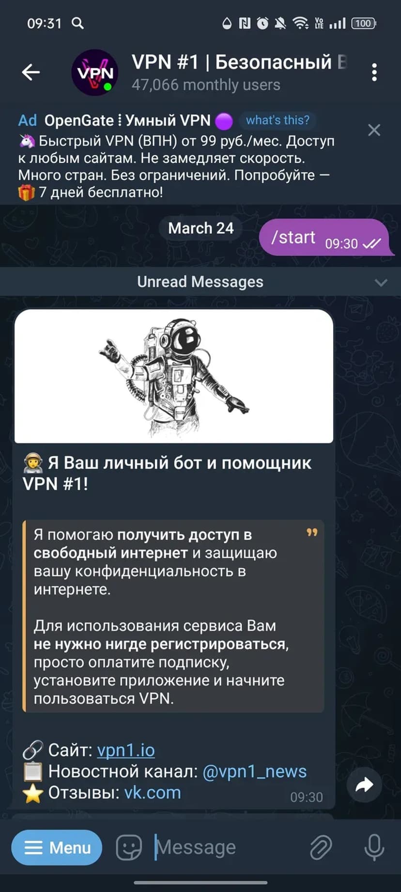*Нажимая "Открыть в Telegram", вы перейдете к приложению VPN #1 (@vpn1probot) в мессенджере Telegram