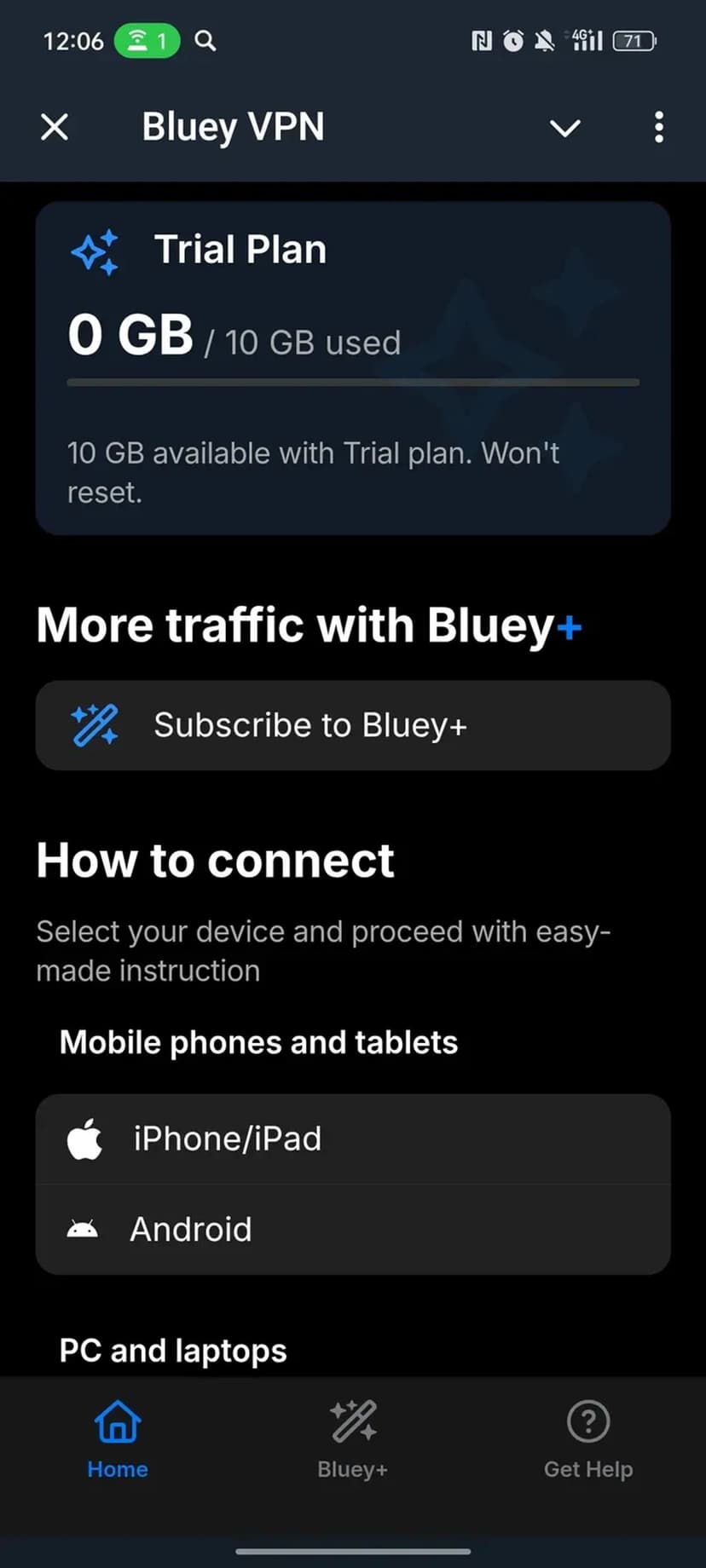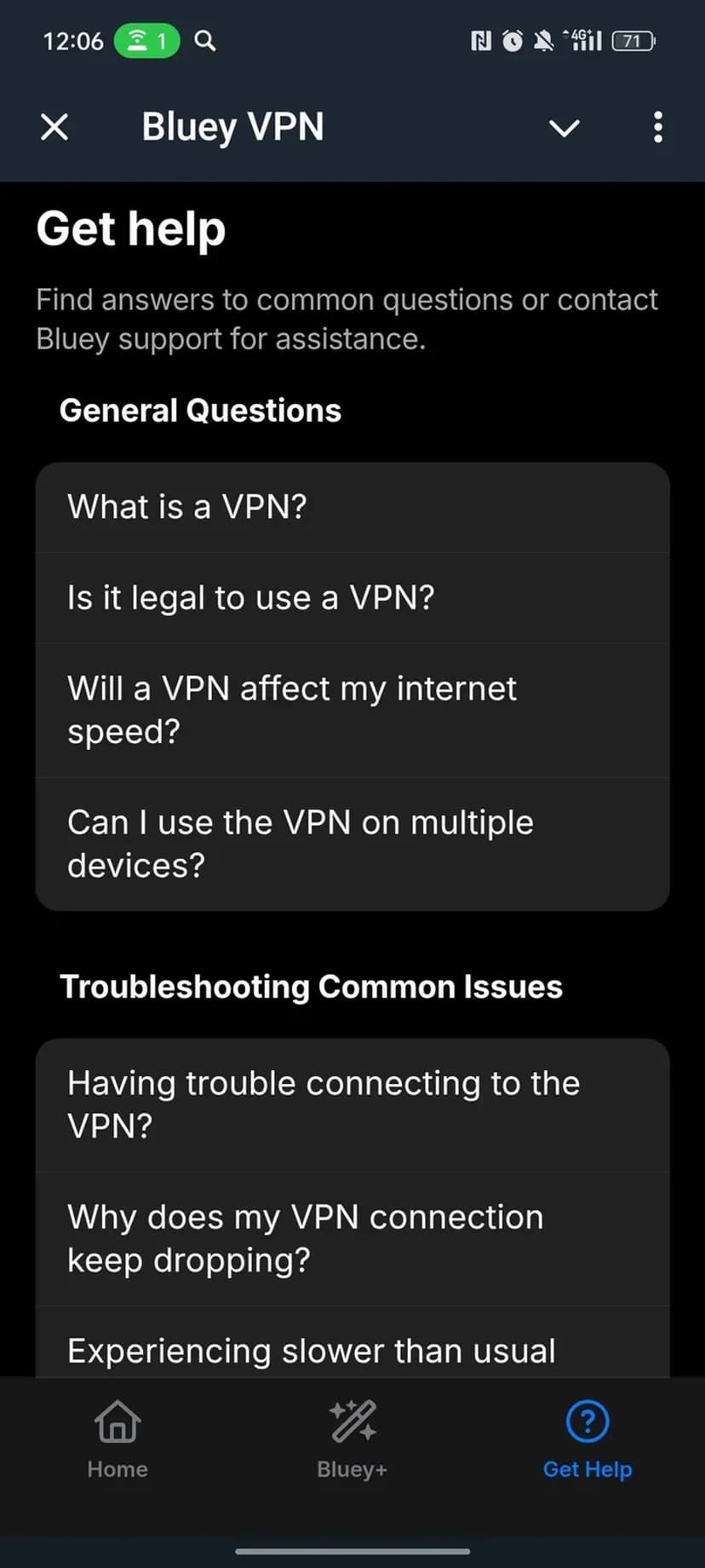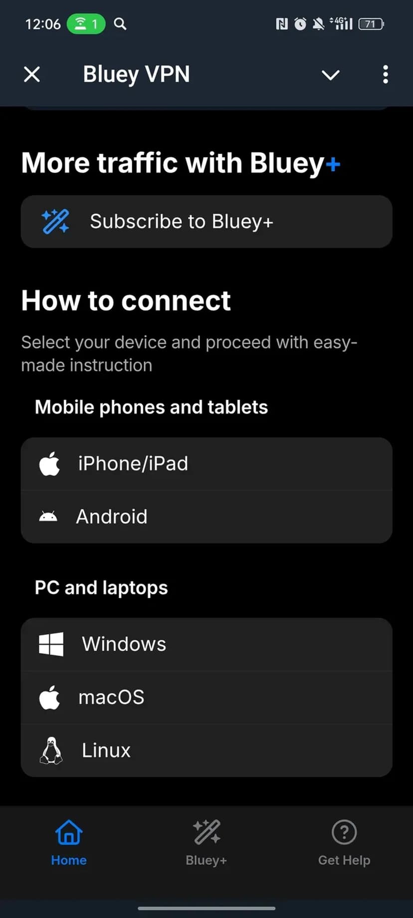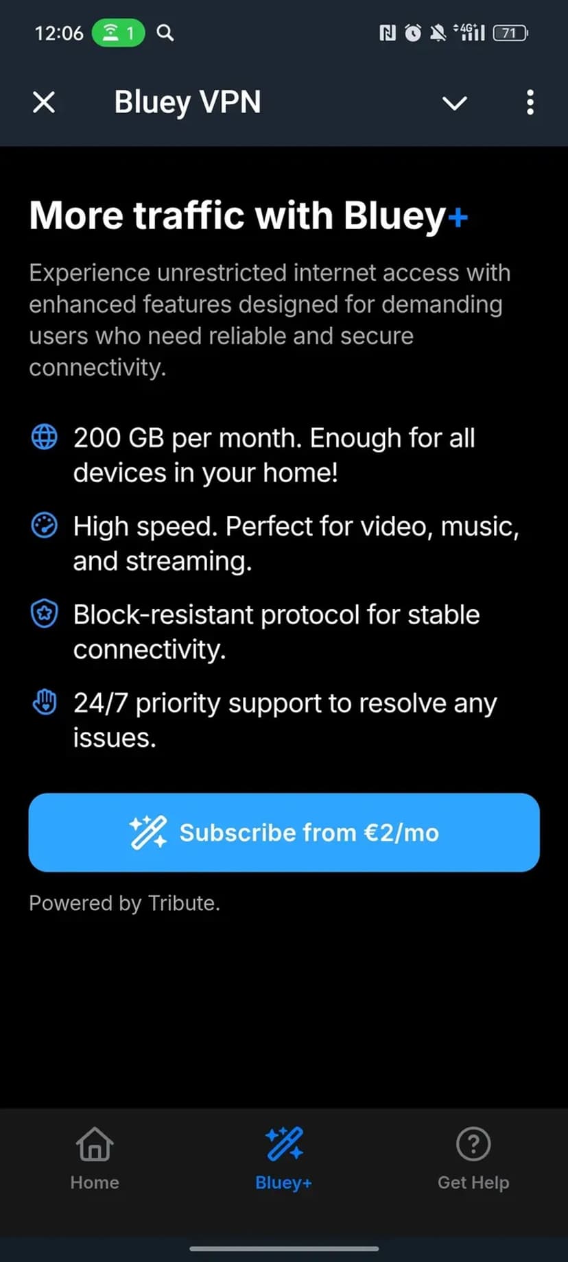 VPN Bluey позволяет быстро подключиться одним нажатием и использовать шифрованный канал для защиты трафика и обхода ограничений — всё управление происходит непосредственно в Telegram-чате.