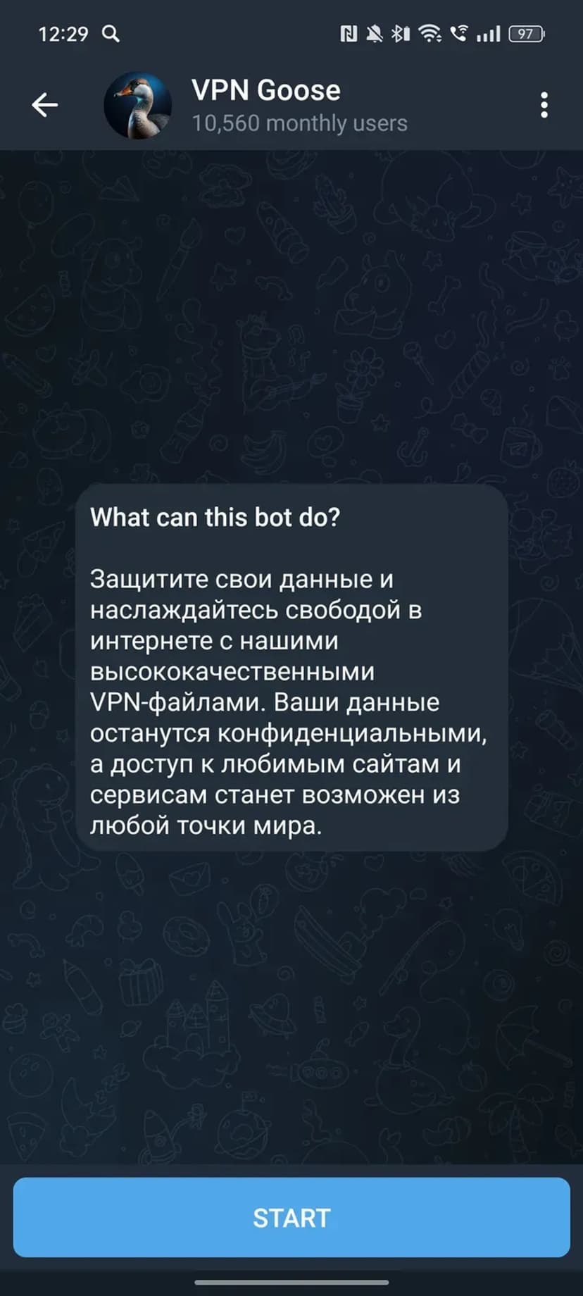 VPN Goose — бот для покупки и управления VPN‑подпиской с оплатой через Telegram Stars. Сервис обеспечивает быстрый и защищённый доступ в интернет с использованием проверенных протоколов шифрования.