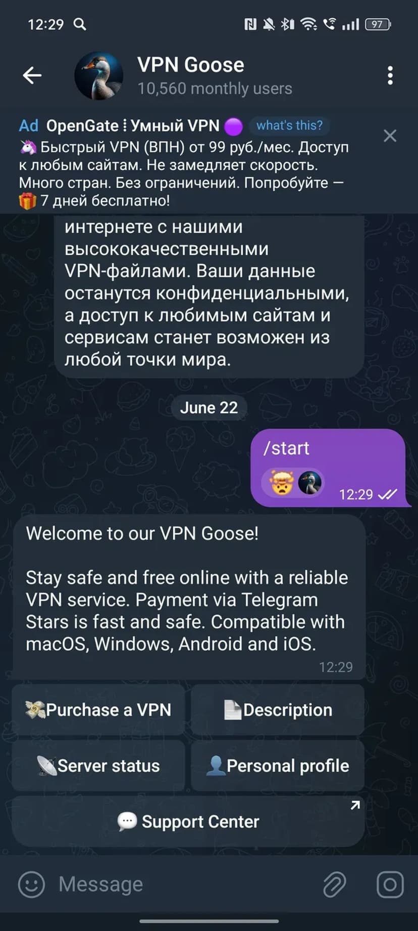 *Нажимая "Открыть в Telegram", вы перейдете к приложению VPN Goose в мессенджере Telegram