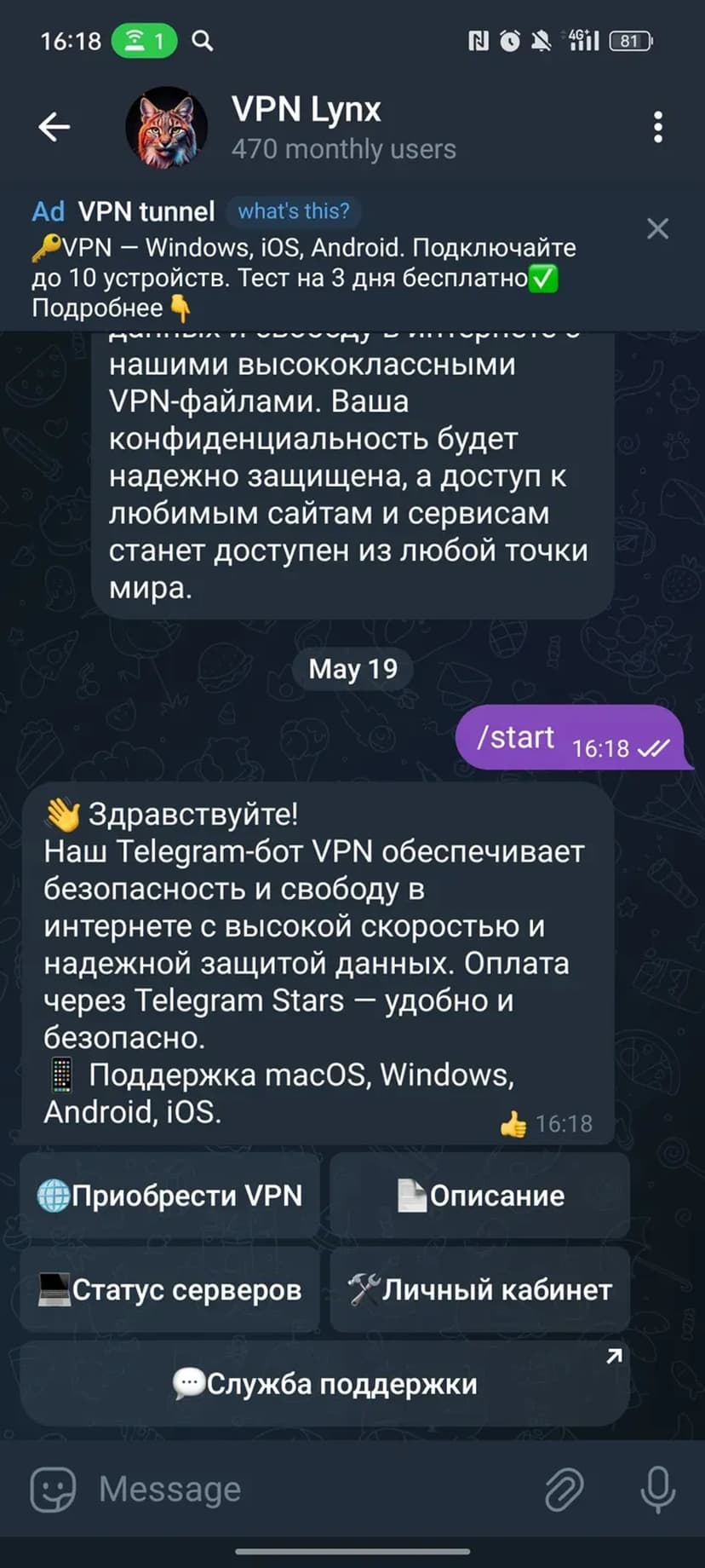 VPN Lynx — мини‑сервис в Telegram для быстрой покупки VPN‑доступа с оплатой через Telegram Stars. Поддерживаются macOS, Windows, Android и iOS, что позволяет использовать доступ на большинстве устройств.