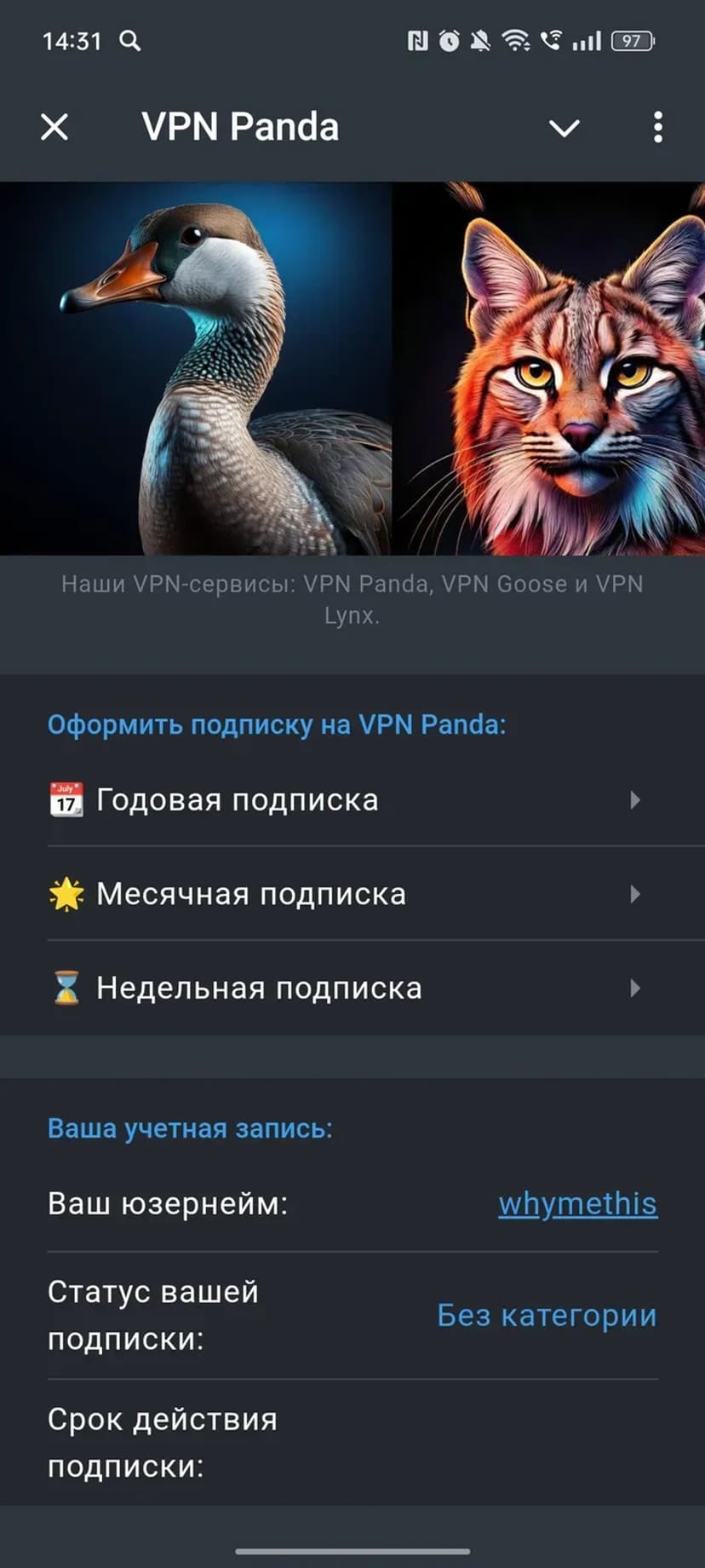 VPN Panda даёт возможность быстро оформить подписку на VPN внутри Telegram и оплатить её через Telegram Stars, без использования внешних платёжных сервисов.