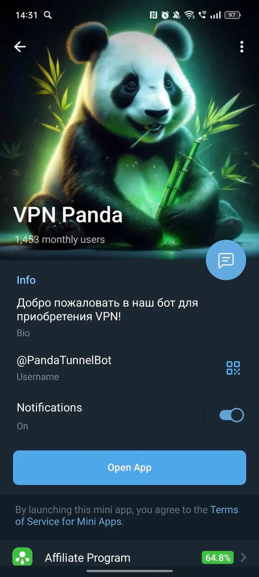 *Нажимая "Открыть в Telegram", вы перейдете к приложению VPN Panda в мессенджере Telegram