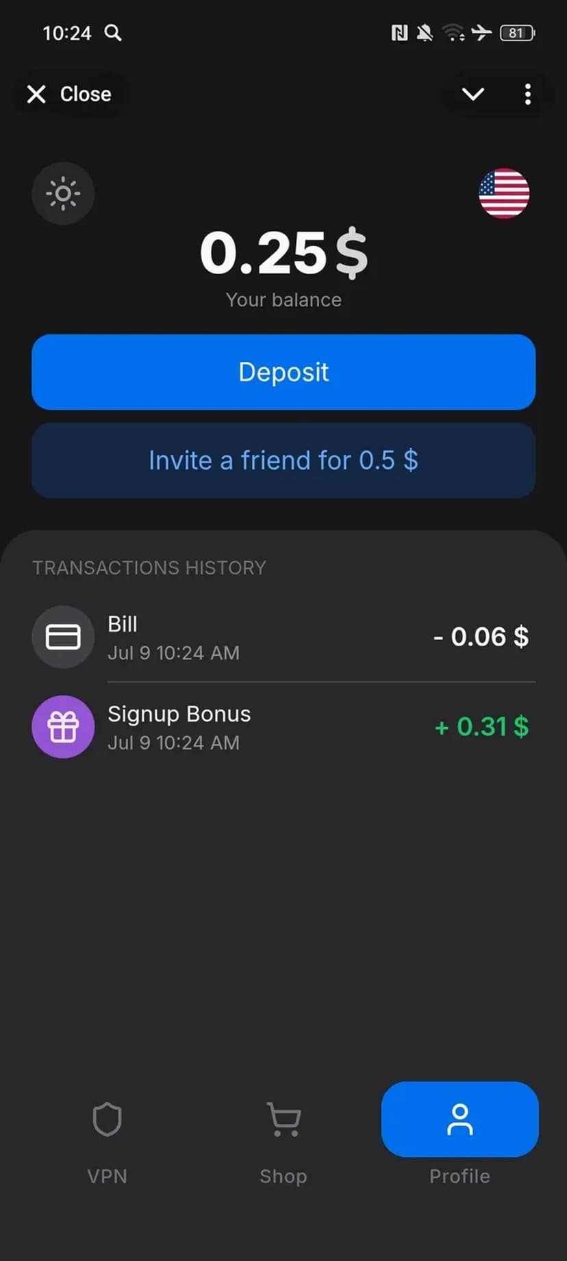 При первом запуске открывается стартовый экран с краткой информацией о сервисе и вариантами подключения. Управление выполнено в виде простого меню с кнопками для выбора сервера, получения инструкций по настройке и перехода к службе поддержки через отдельного бота.