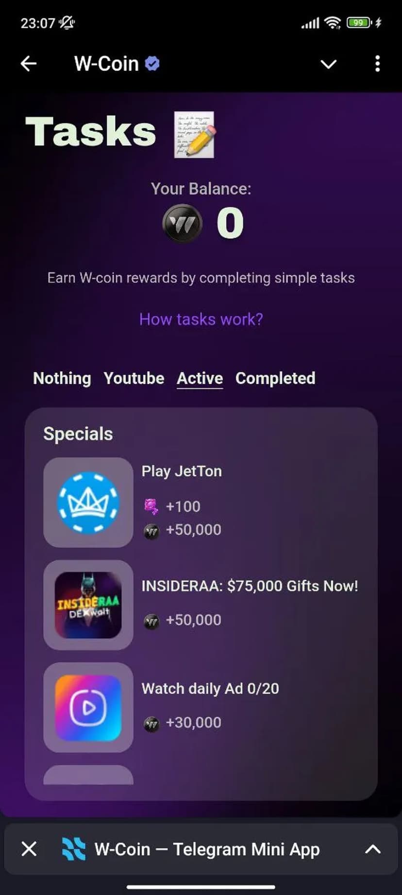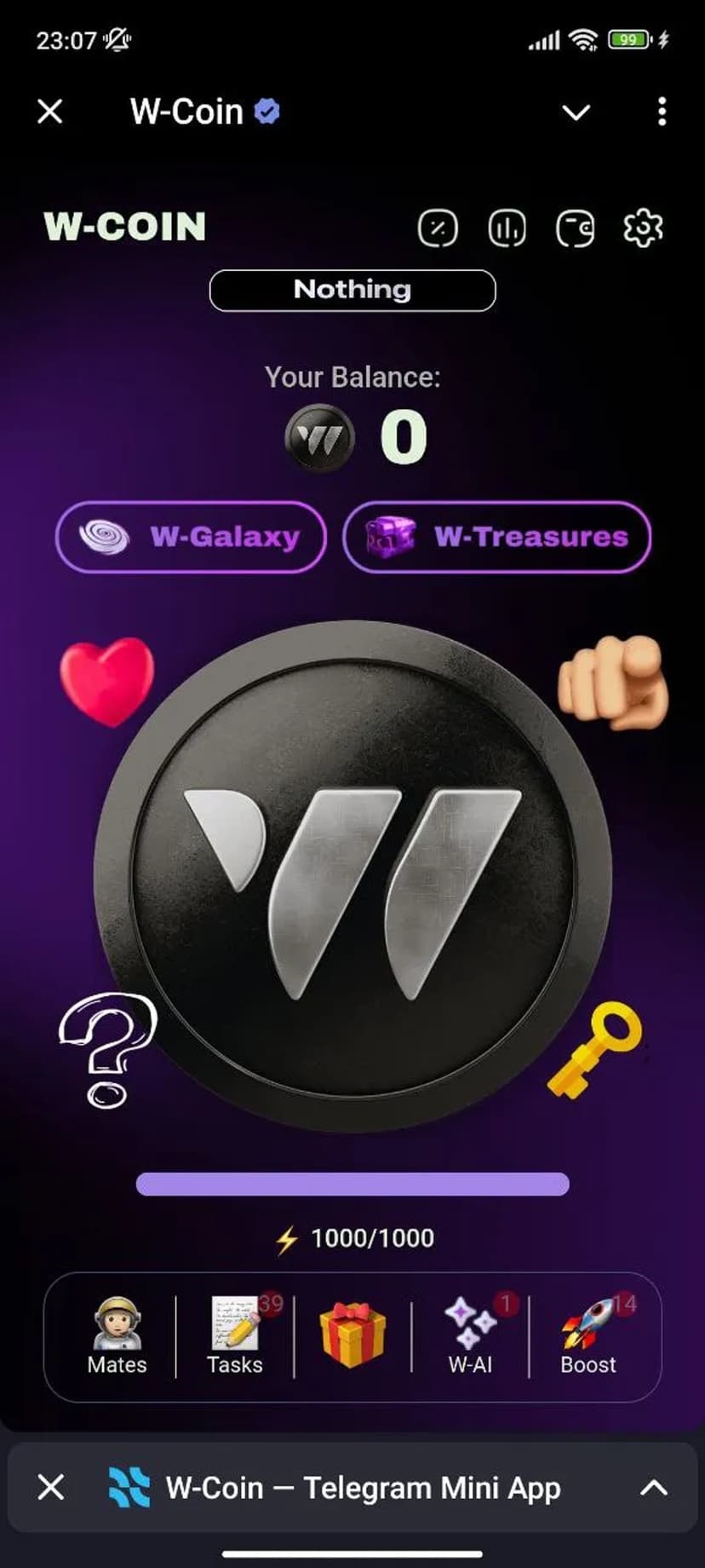 - Тапинг. На главном экране отображается иконка W‑Coin: каждое нажатие увеличивает ваш баланс токенов.