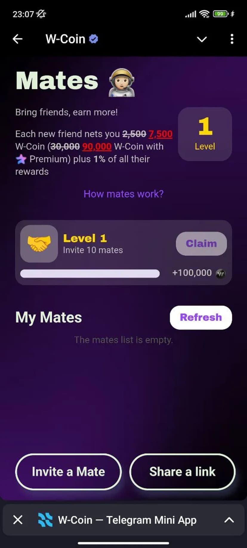 - Реферальная система. Вкладка «Mates» позволяет приглашать друзей — за каждого новичка начисляют 2500 токенов и 1% от их дохода.