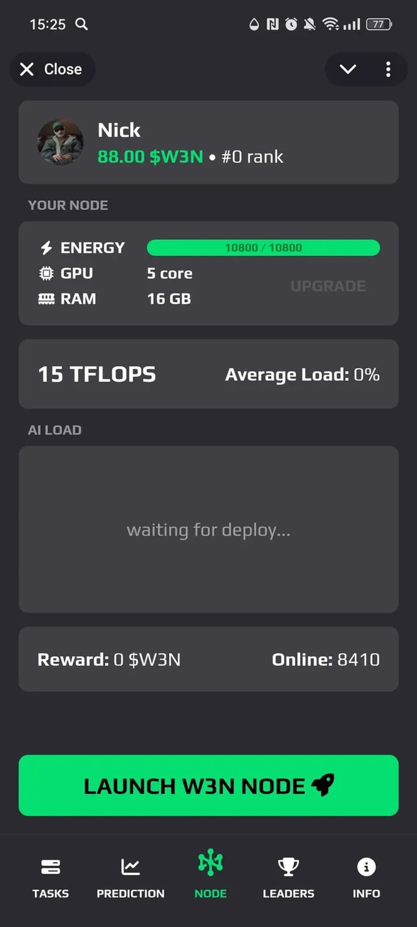 - Запуск AI-нода: используйте вычислительные ресурсы устройства (GPU, RAM, энергия) — за активную работу ноды начисляются W3N.