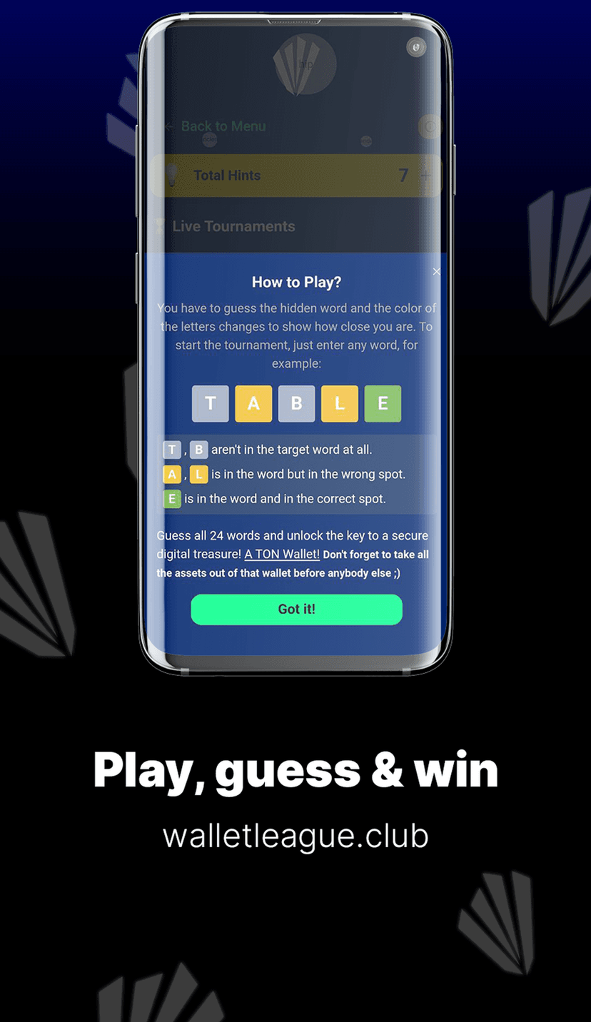 Wallet League π β ΠΌΠΈΠ½ΠΈβΠΏΡΠΈΠ»ΠΎΠΆΠ΅Π½ΠΈΠ΅, Π² ΠΊΠΎΡΠΎΡΠΎΠΌ ΠΈΠ³ΡΠΎΠΊΠΈ ΠΎΡΠ³Π°Π΄ΡΠ²Π°ΡΡ ΡΠ»ΠΎΠ²Π° seedβΡΡΠ°Π·Ρ (Π² Π½Π°Π±ΠΎΡΠ΅ 24 Π²Π°ΡΠΈΠ°Π½ΡΠΎΠ²) ΠΏΠΎ ΠΏΡΠΈΠ½ΡΠΈΠΏΡ wordle. ΠΡΠ°Π²ΠΈΠ»ΡΠ½Π°Ρ ΡΠ°Π·Π³Π°Π΄ΠΊΠ° ΡΡΠΎΠ²Π½Ρ ΠΎΡΠΊΡΡΠ²Π°Π΅Ρ Π΄ΠΎΡΡΡΠΏ ΠΊ ΠΊΠΎΡΠ΅Π»ΡΠΊΡ Ρ ΠΏΡΠΈΠ·ΠΎΠ²ΡΠΌ ΡΠΎΠ½Π΄ΠΎΠΌ Π² TON.