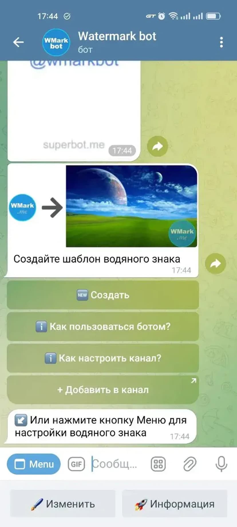 Watermark bot (wmark.me) позволяет быстро наносить текстовые водяные знаки на фотографии, GIF и видеоролики прямо в чате — удобно защищать и маркировать медиа перед публикацией.