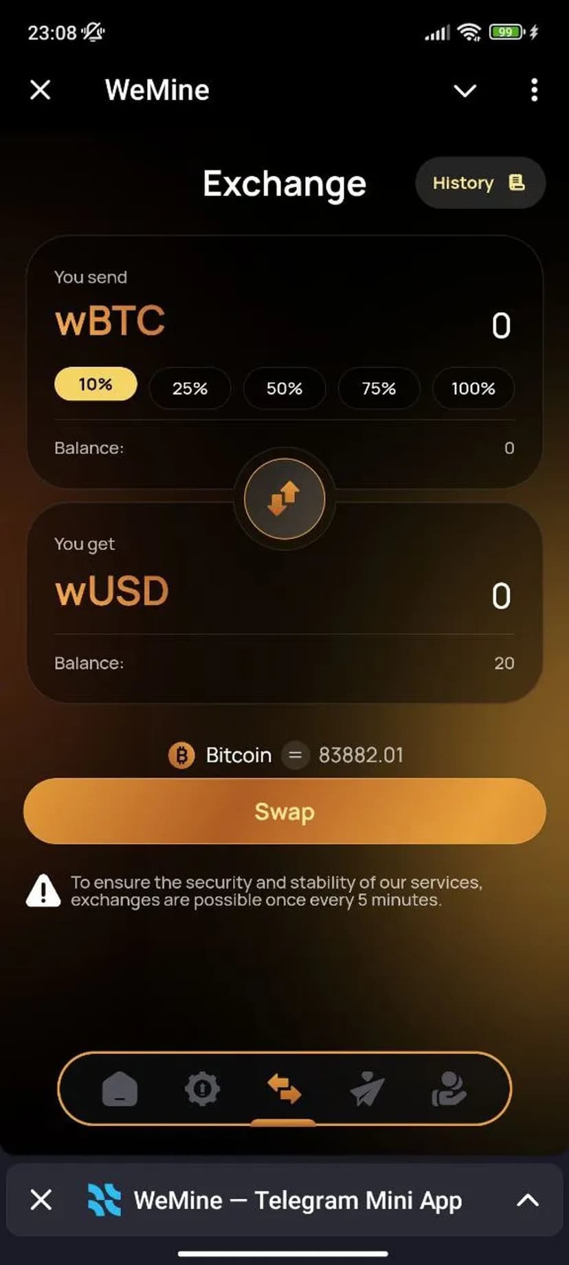 WeMine — кликер с элементами экономической симуляции, запущенный 24 сентября 2024 года. Пользователи развивают виртуальную майнинг-ферму для добычи внутренних токенов wBTC и wUSD.