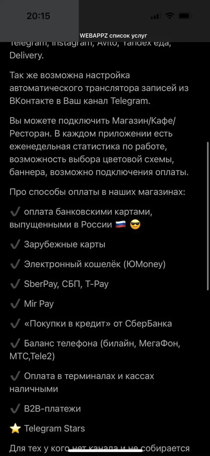 webappz connect позволяет оперативно запустить онлайн‑магазин или меню прямо в Telegram без отдельного сайта и сложных технических настроек.
