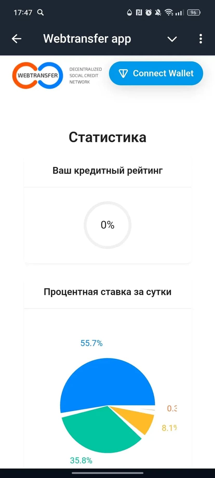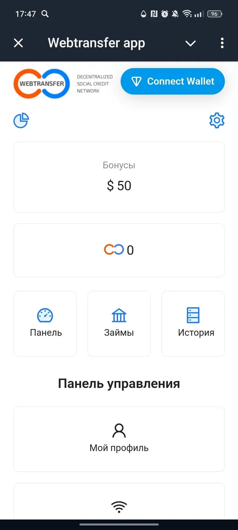 Webtransfer — p2p-платформа для социального кредитования в формате мини‑приложения Telegram. Сервис даёт возможность напрямую выдавать и получать займы, управлять партнёрской программой и контролировать баланс. Новые пользователи получают бонусы за регистрацию и за приглашения, а все транзакции приносят $WEB‑кредиты, которые в перспективе можно конвертировать в токены $WEB.
