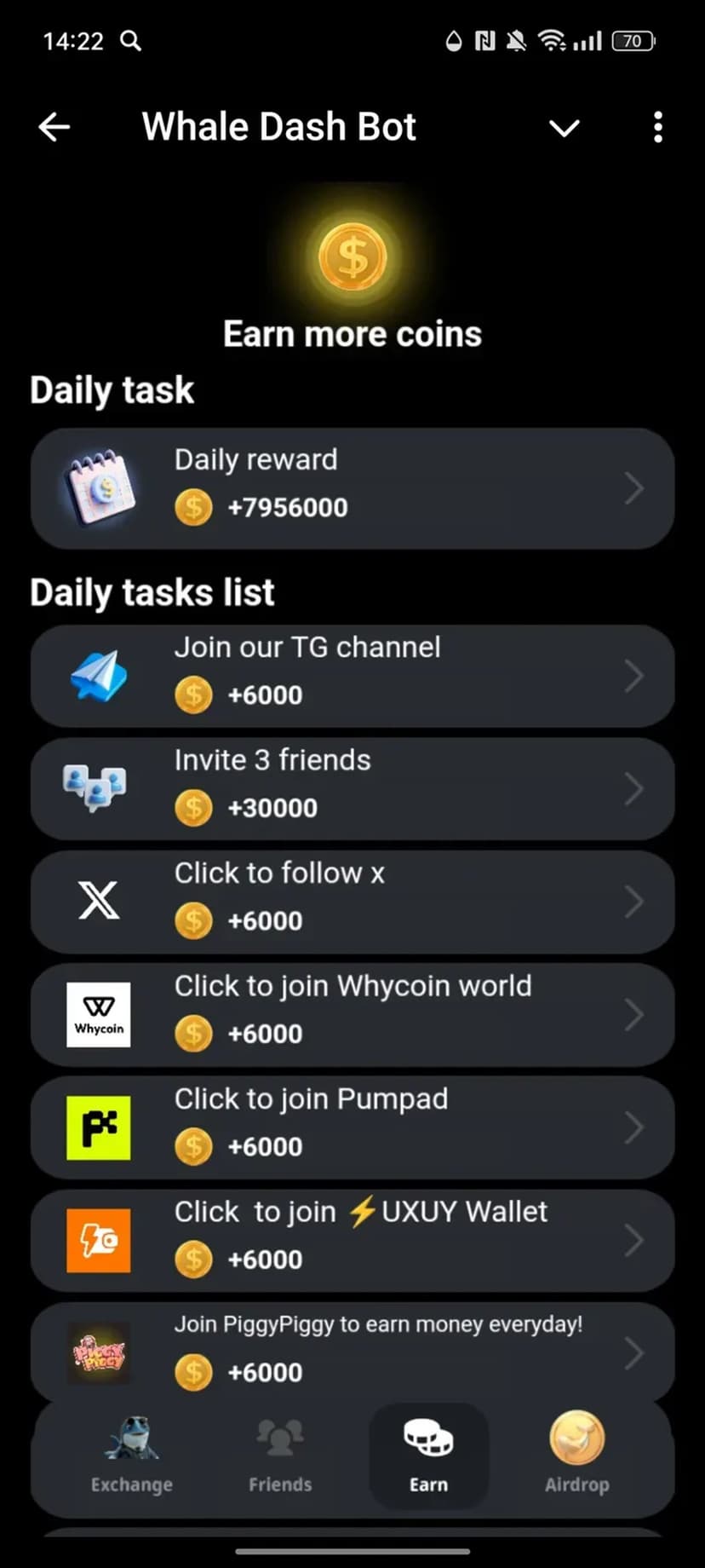 Whale Dash Bot — симулятор крипто‑инвестора с минималистичным интерфейсом. Приложение фокусируется на сборе внутриигровых монет, выполнении временных заданий и прокачке источников дохода.