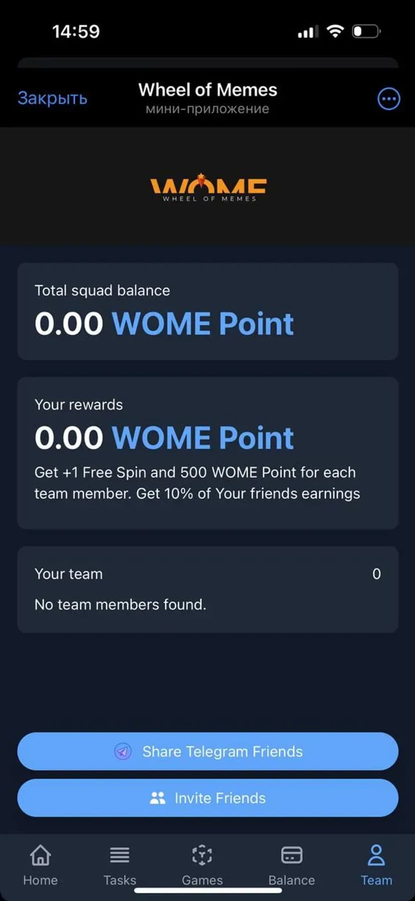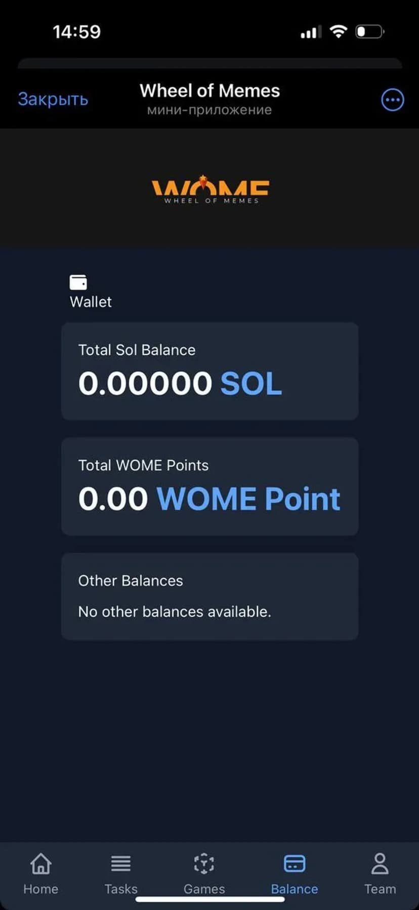 Wheel of Memes даёт шанс вращать призовое колесо и получать награды, привязанные к Solana и WOME. Пользователь получает одну бесплатную попытку каждые три часа; дополнительные ходы начисляются за приглашения друзей.