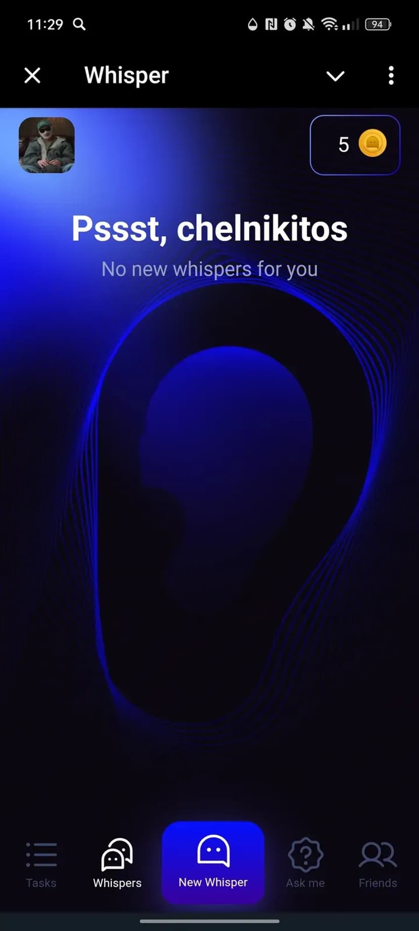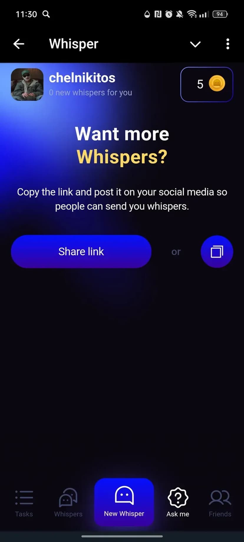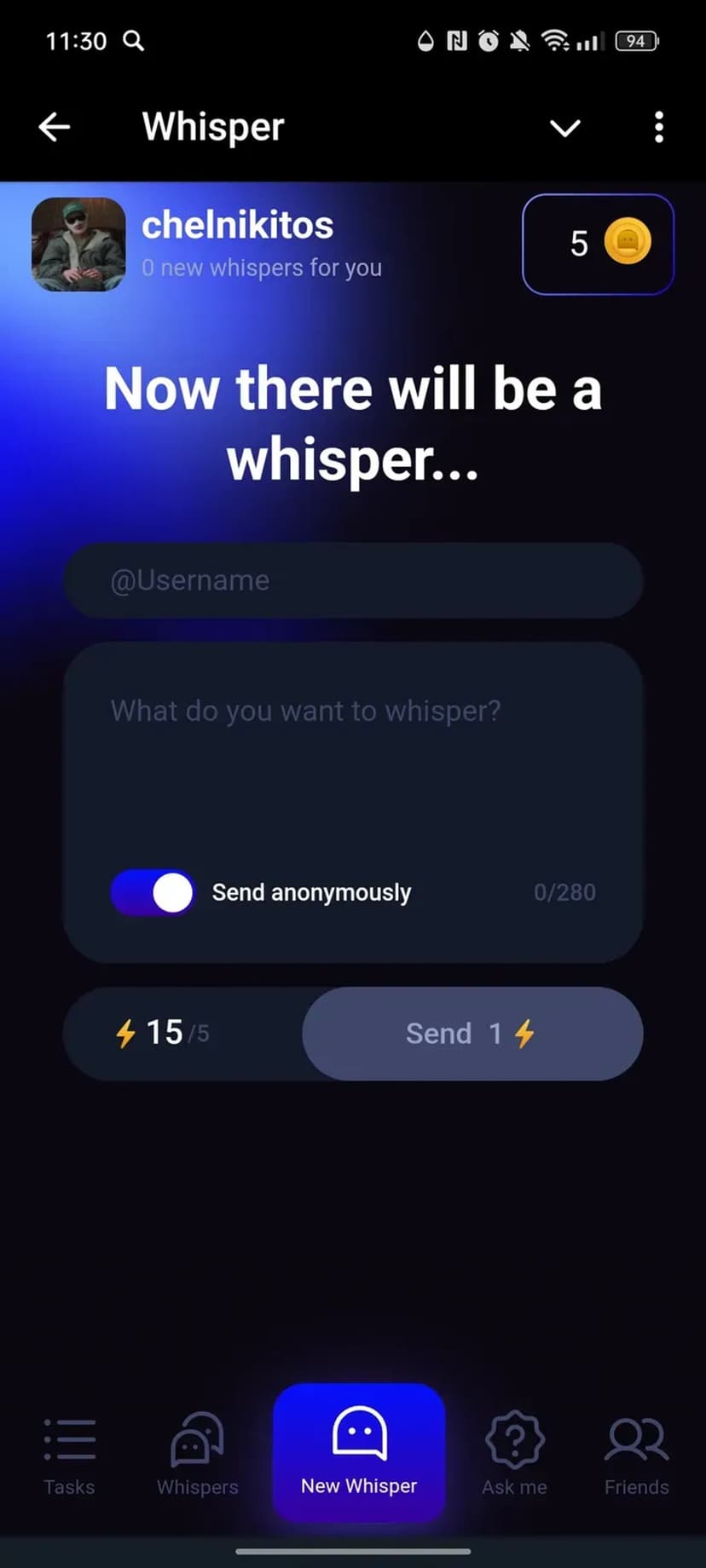 Whisper предлагает простой и лаконичный интерфейс с акцентом на анонимность и лёгкость использования. На главном экране доступны основные действия: отправить анонимное сообщение, получить ссылку для приёма сообщений, просмотреть входящие и перейти к заданиям.