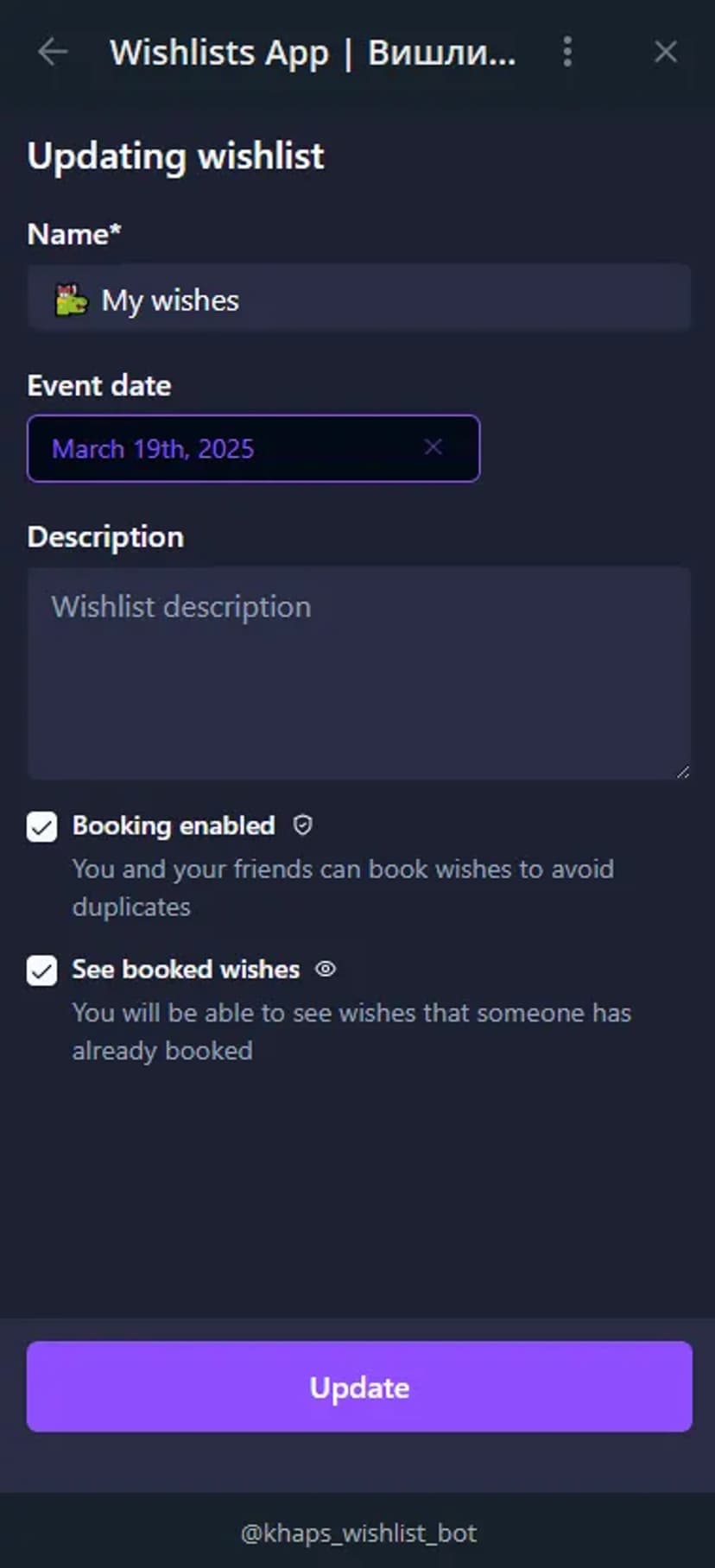 Wishlists App — мини‑сервис в Telegram для создания и совместного ведения списков желаемых подарков. Приложение позволяет быстро сформировать вишлист с названием, описанием и при необходимости ссылкой или изображением, после чего получить уникальную ссылку для публикации и обмена.