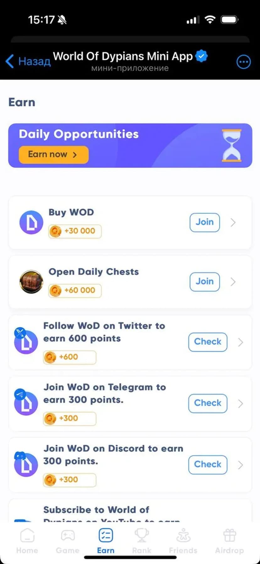 World Of Dypians Mini App — игровая Web3-платформа внутри Telegram. Выполняйте ежедневные задания, участвуйте в квестах и челленджах, приглашайте друзей и получайте реальные вознаграждения в USDT.