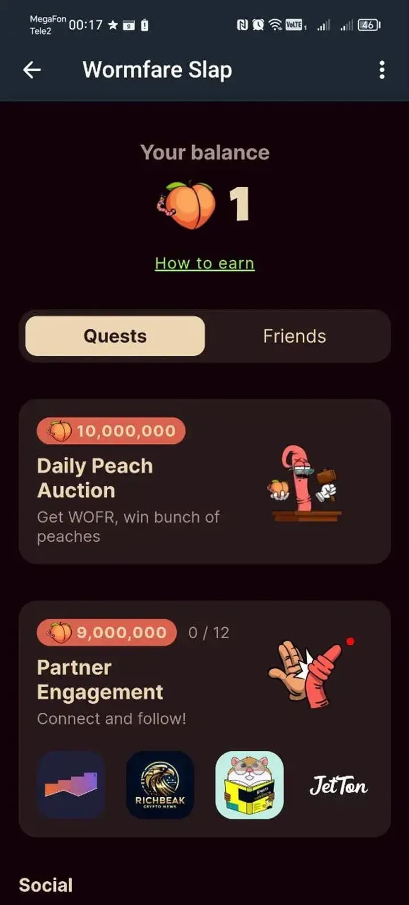 Wormfare Slap — юмористическая мини-игра внутри Telegram. Шлёпайте червяка, зарабатывайте виртуальные персики и обменивайте их на периодически обновляемые награды.