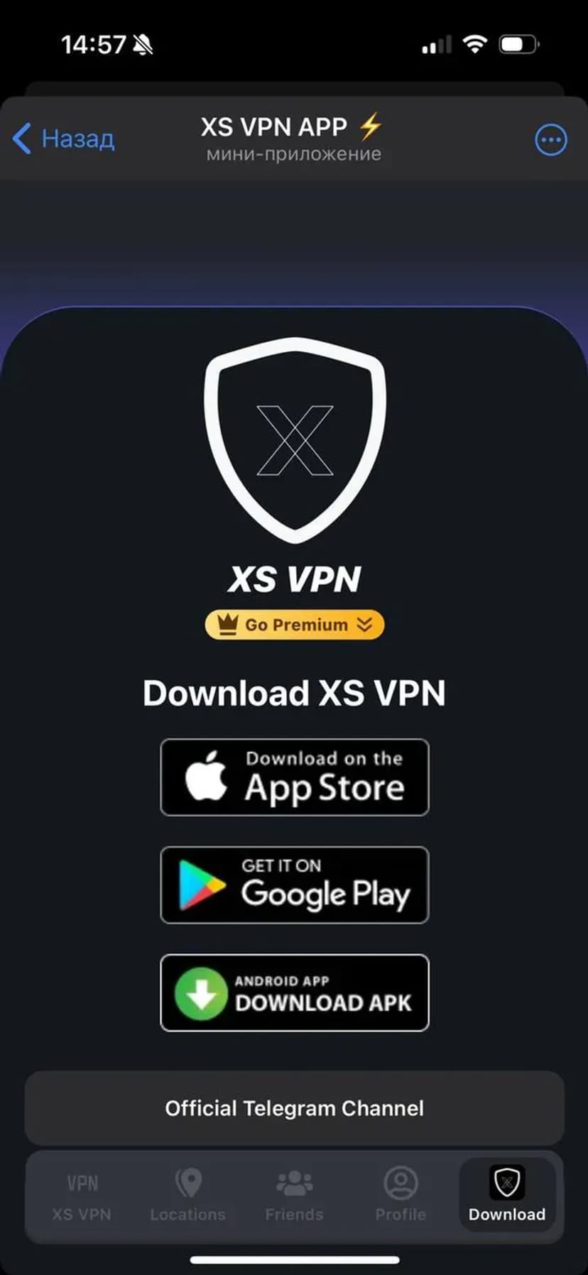 *Нажимая "Открыть в Telegram", вы перейдете к приложению XS VPN APP ⚡️ в мессенджере Telegram