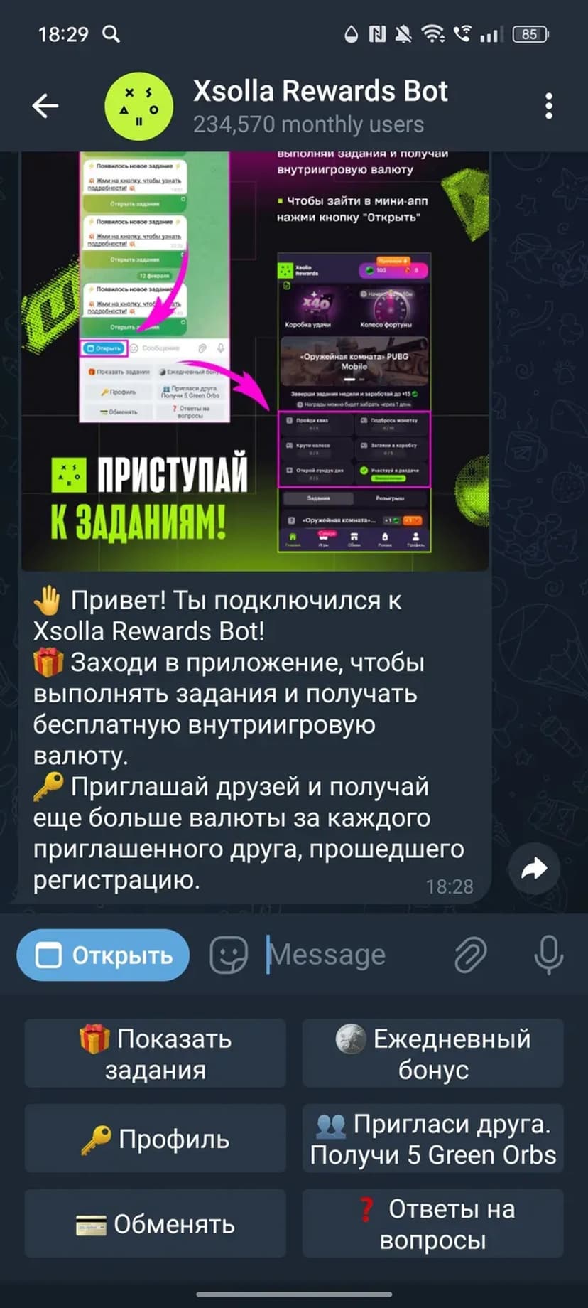 *Нажимая "Открыть в Telegram", вы перейдете к приложению Xsolla Rewards Bot в мессенджере Telegram